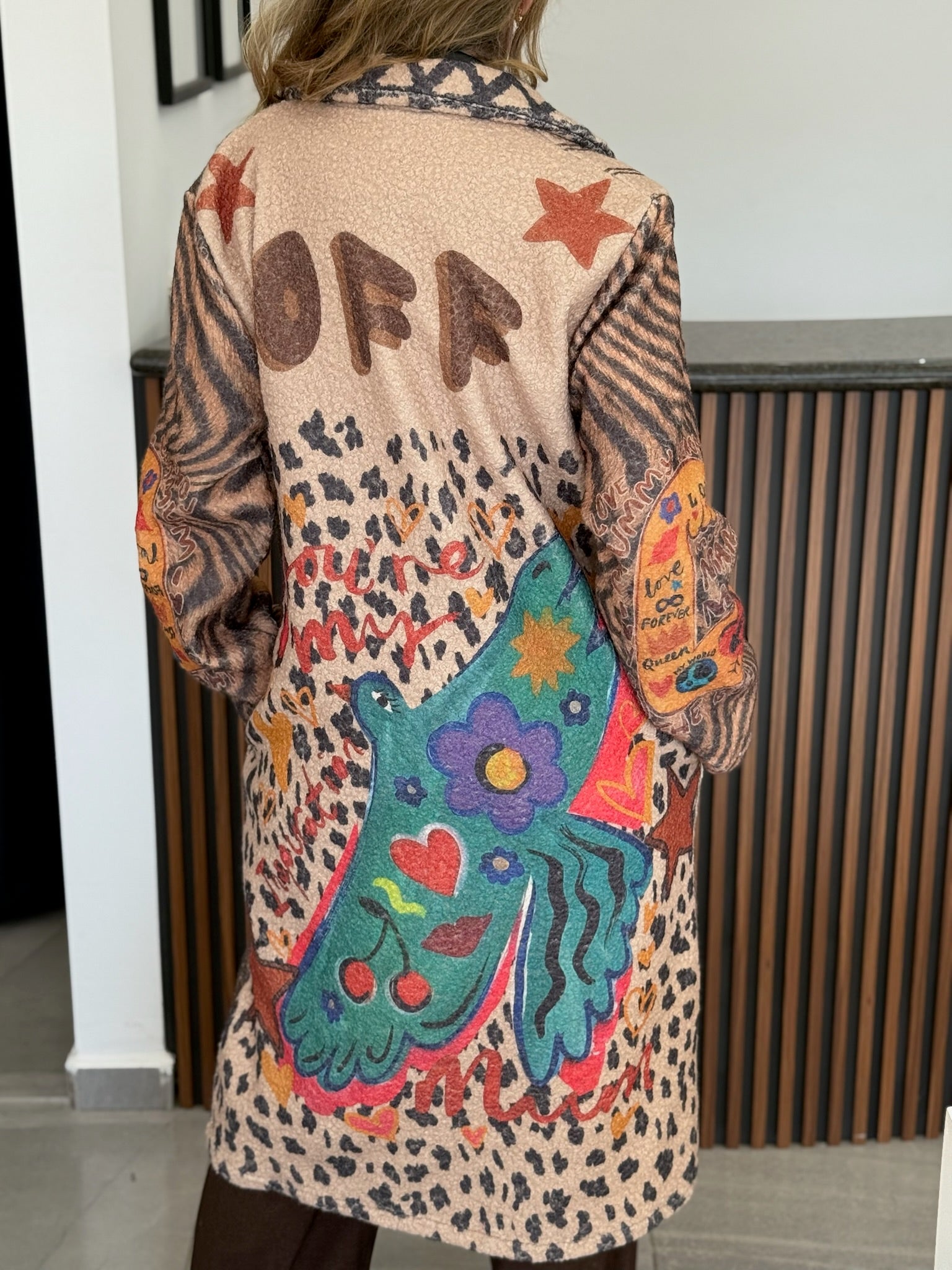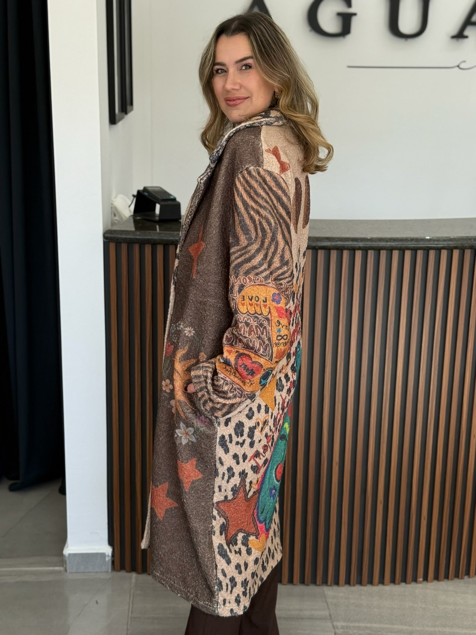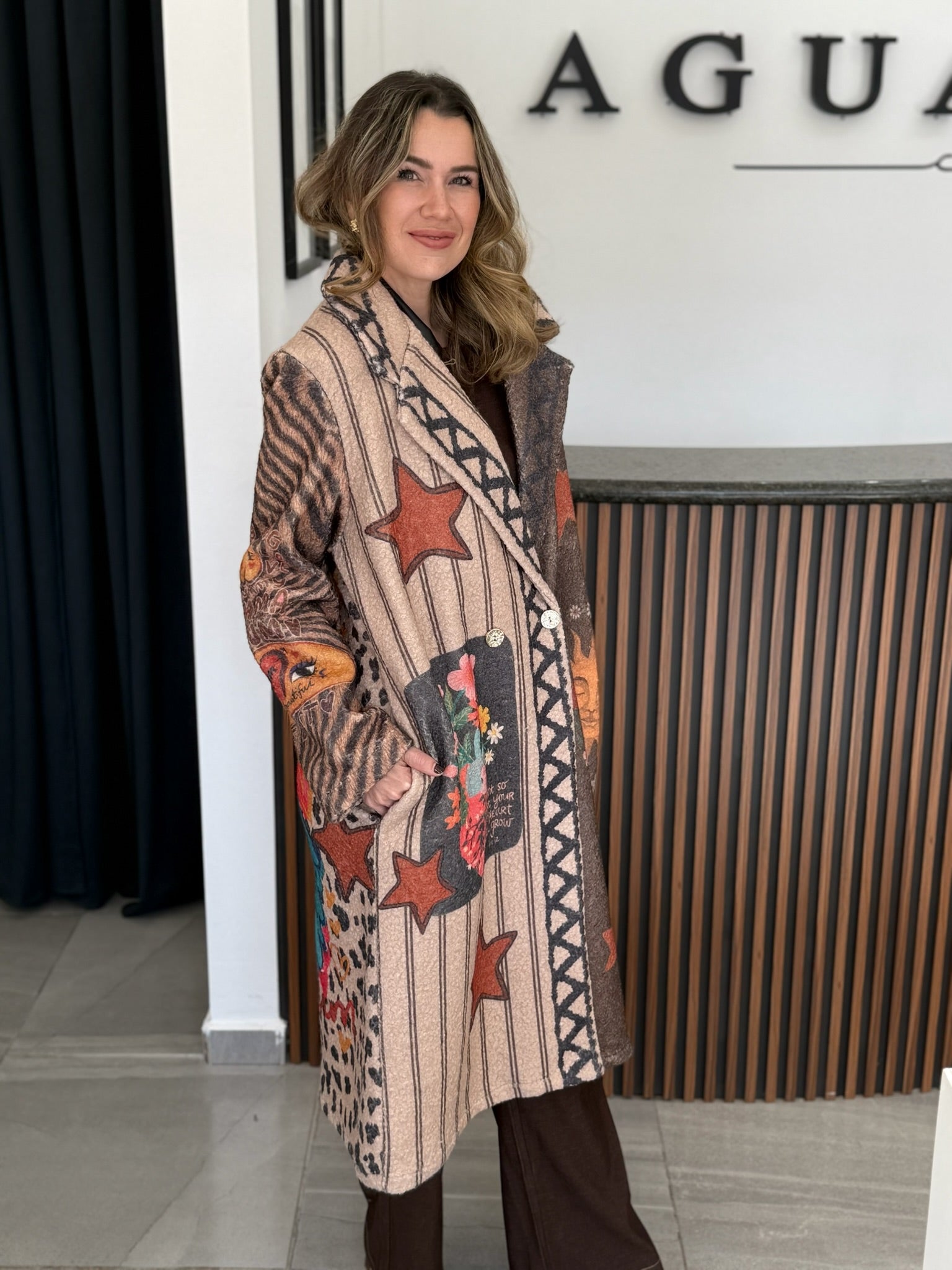 Abrigo tejido con estampado bohemio de soles, estrellas y flores en tonos cálidos. Su diseño artesanal combina texturas y patrones únicos que aportan carácter y estilo a cualquier outfit. Perfecto para destacar en looks de temporada con un aire artístico y libre.