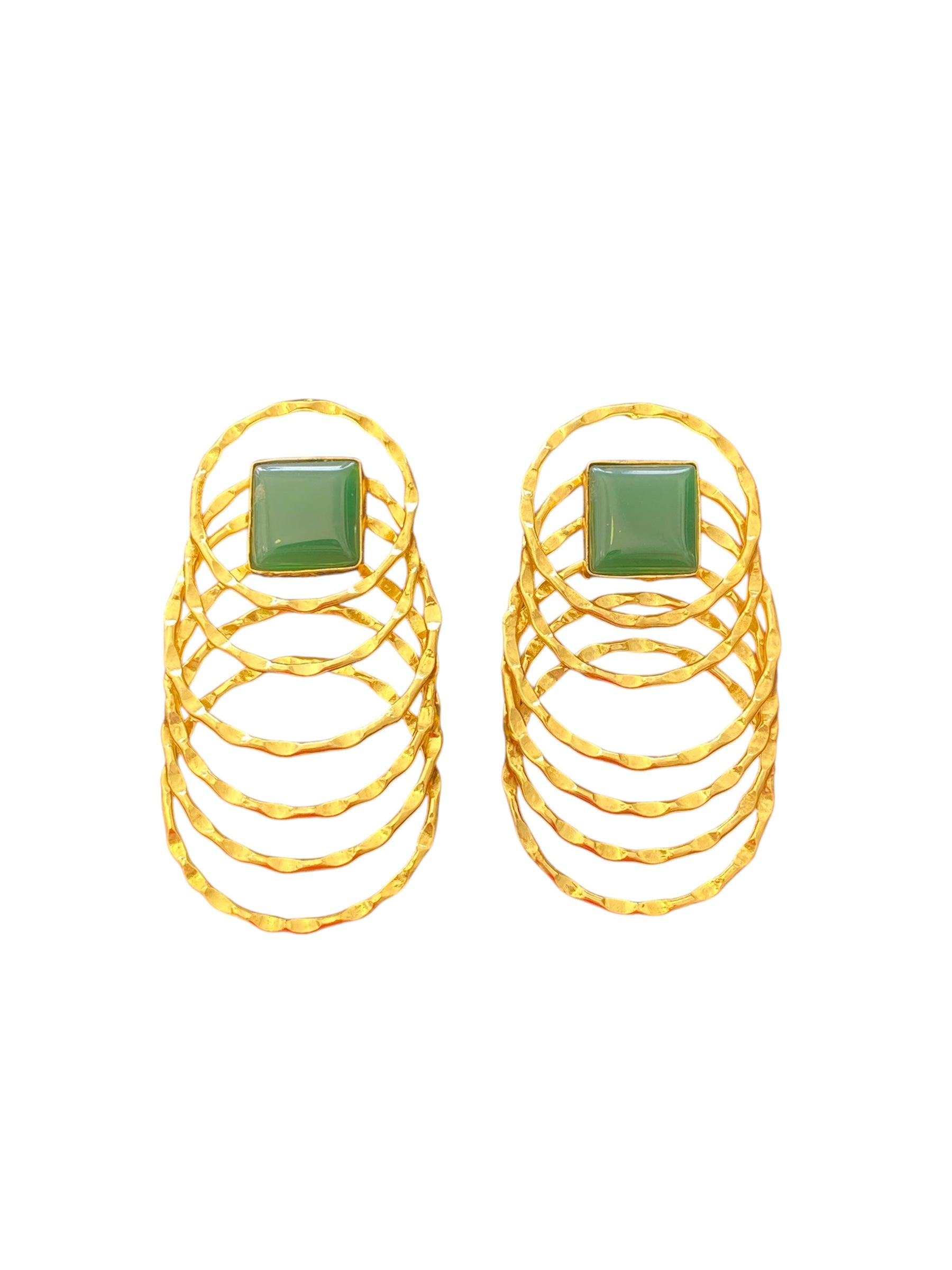 Un diseño sofisticado que fusiona movimiento y color. Los aretes Adelaida destacan por su estructura de aros dorados entrelazados y una piedra central azul profundo, creando un balance entre dinamismo y distinción. Ideales para elevar cualquier look con un toque de brillo sutil.