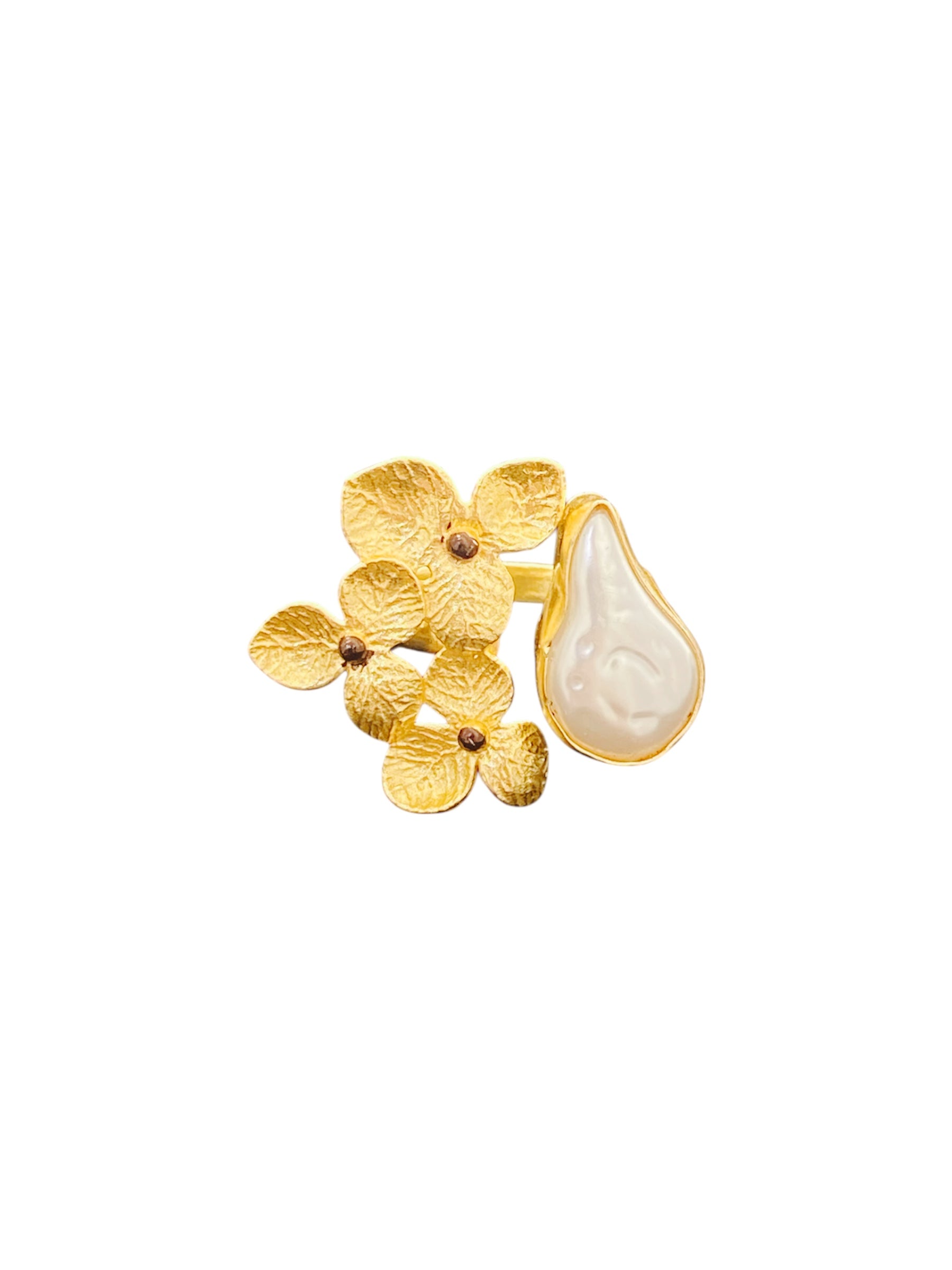 Anillo con tres flores doradas texturizadas y perla tipo lágrima. Una combinación elegante y natural.