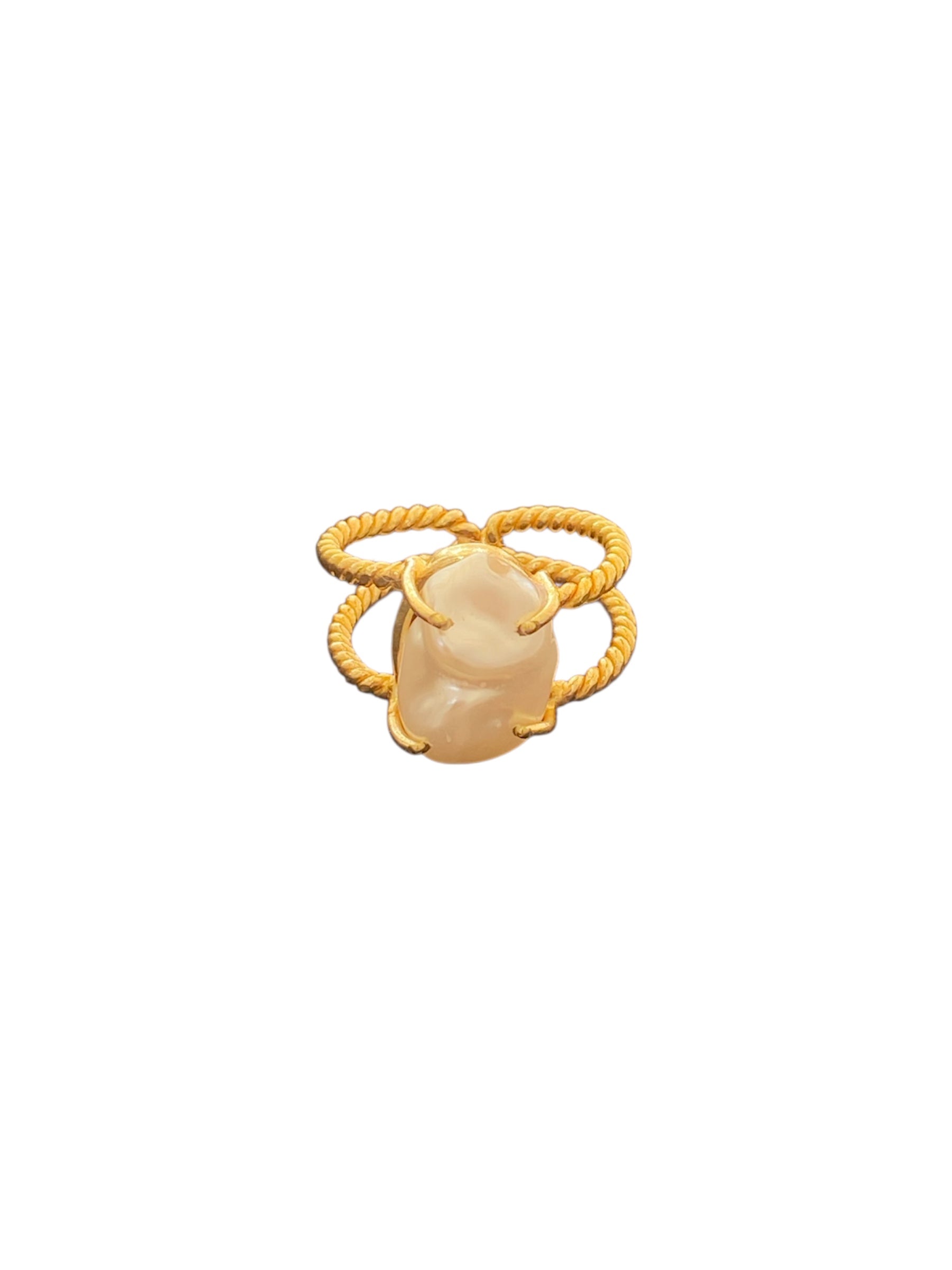 Anillo de doble aro trenzado dorado con piedra tipo perla en forma irregular. Ligero y con estilo orgánico.