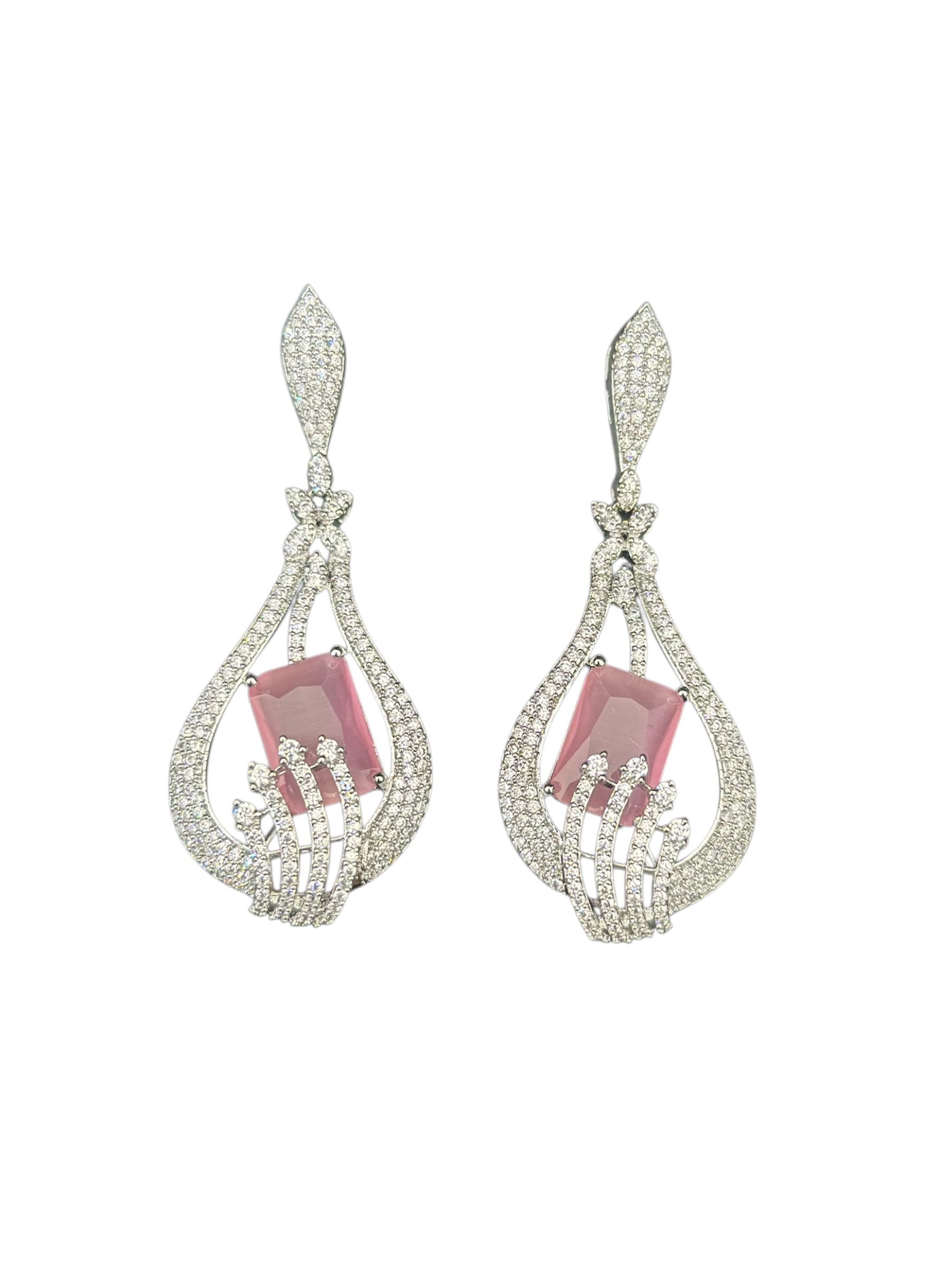 Aretes largos con diseño tipo lágrima, finamente adornados con microcristales que aportan un brillo excepcional. Su gema central facetada añade un toque sofisticado y moderno al conjunto. La estructura estilizada crea una silueta elegante, ideal para ocasiones especiales o looks formales. Una pieza que destaca por su lujo y delicadeza.