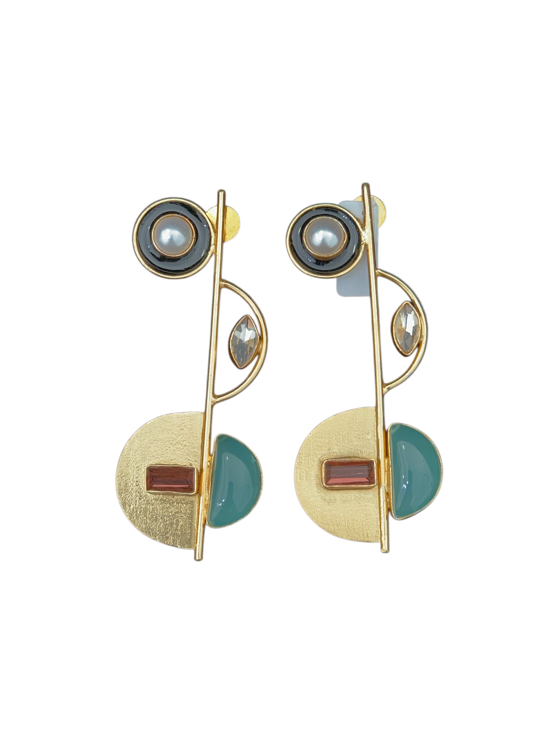 Aretes de diseño artístico con una mezcla moderna de formas geométricas, perlas y cristales enmarcados en baño dorado. Su composición asimétrica y elegante los convierte en una pieza llamativa y sofisticada. Perfectos para looks contemporáneos que buscan un toque único y vanguardista. Ligeros, brillantes y diseñados para destacar con estilo.