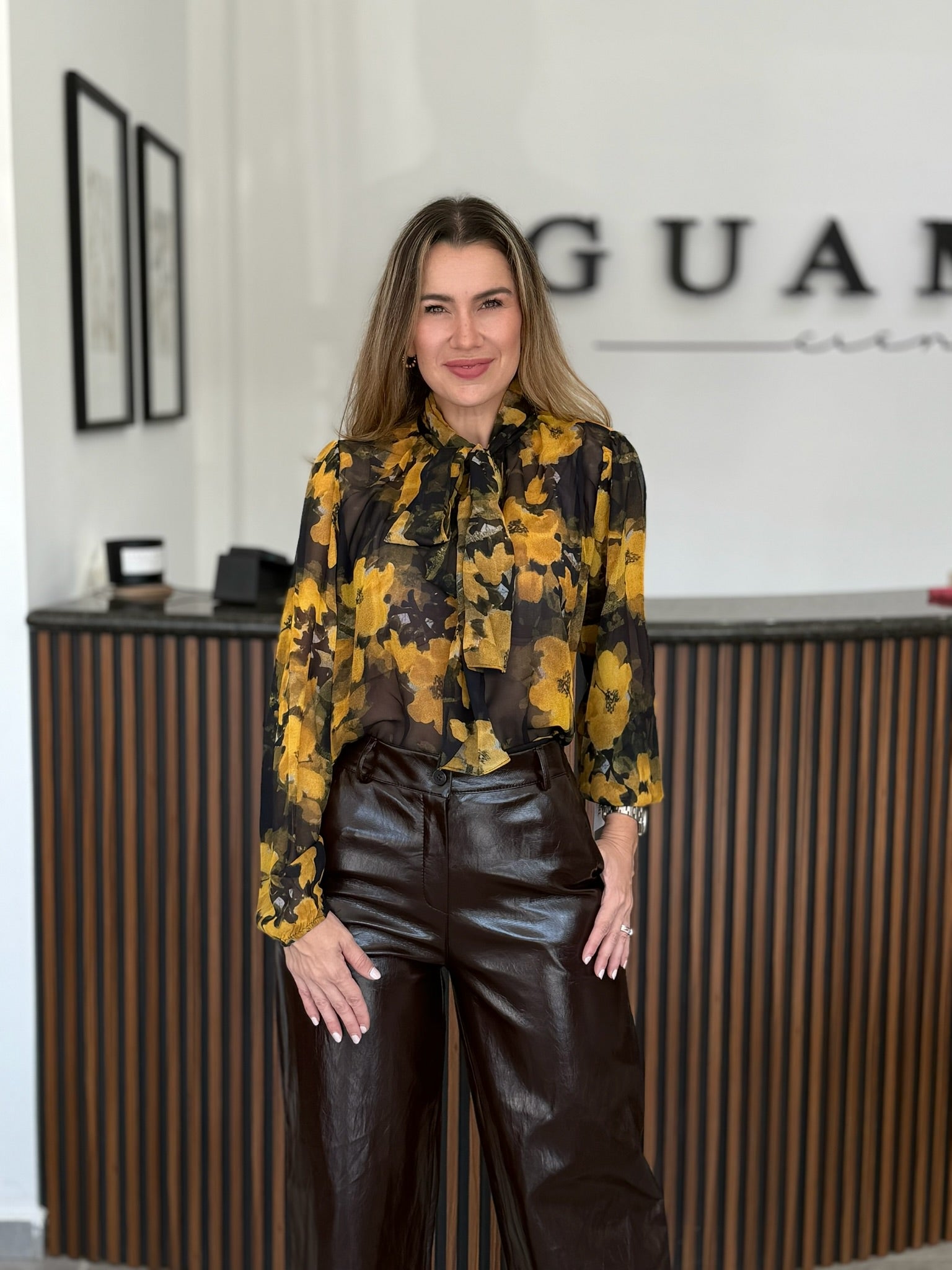 Blusa ligera con estampado floral en tonos mostaza y negro. Corte relajado y caída fluida con efecto traslúcido. Ideal para combinar con mezclilla o pantalón negro.