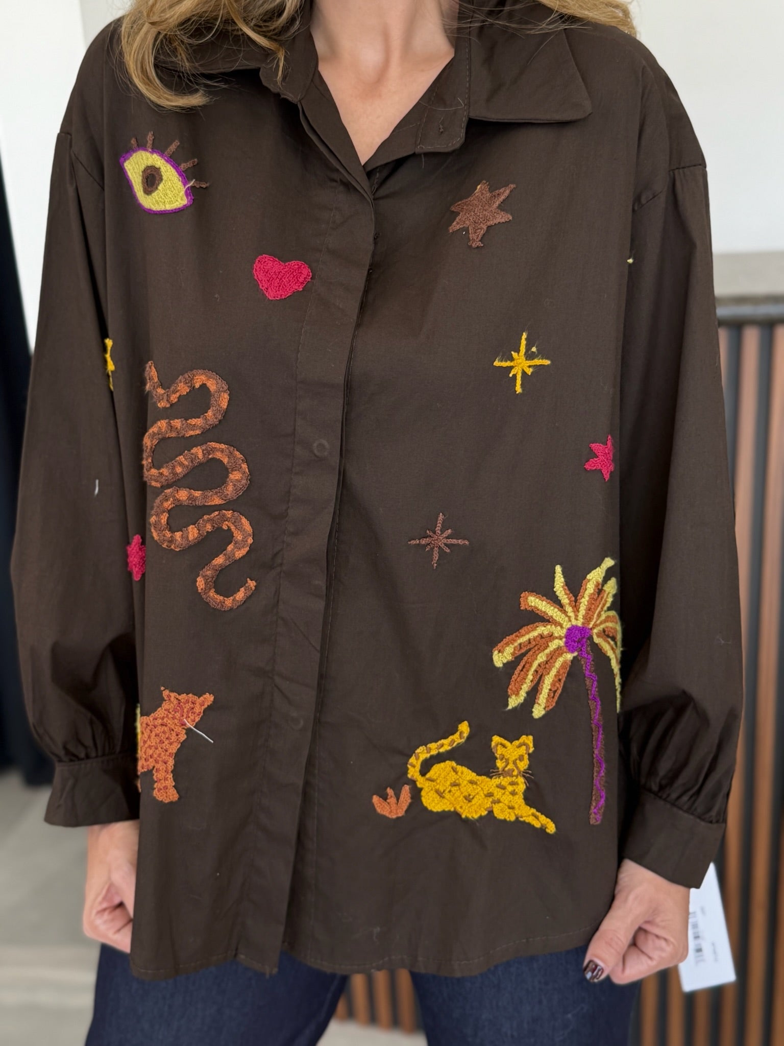 Blusa ligera en tono oscuro con bordados coloridos inspirados en símbolos místicos y naturaleza: estrellas, serpiente, corazón y flores. Su diseño artesanal y relajado le da un aire boho con personalidad única, ideal para combinar con mezclilla o pantalones amplios.