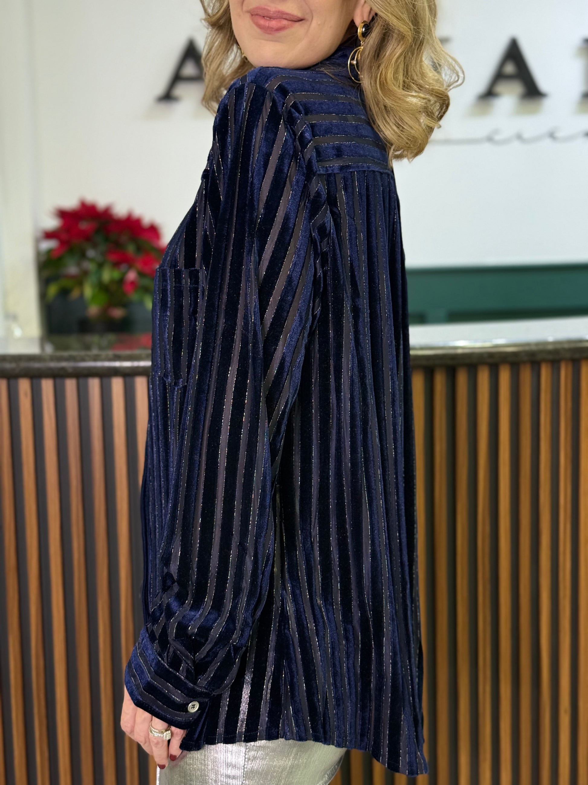 Blusa satinada en tono azul profundo con cinturón ajustable y mangas largas. Elegante, versátil y perfecta para looks formales o casuales con un toque chic.