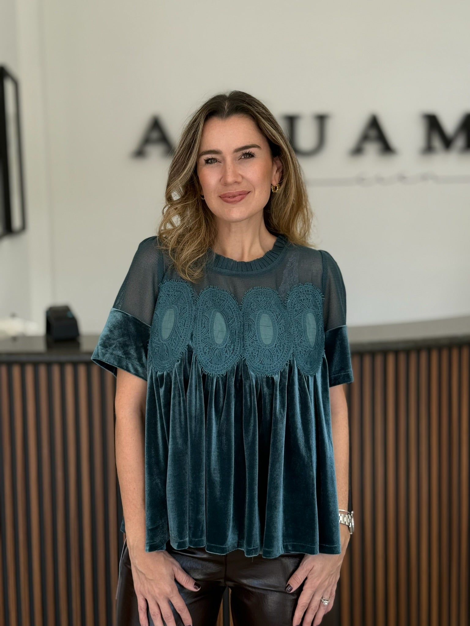 Blusa en tono verde marino con textura aterciopelada y delicado detalle de encaje. Su corte tipo babydoll aporta un aire romántico y sofisticado, ideal para looks de noche o cenas especiales.