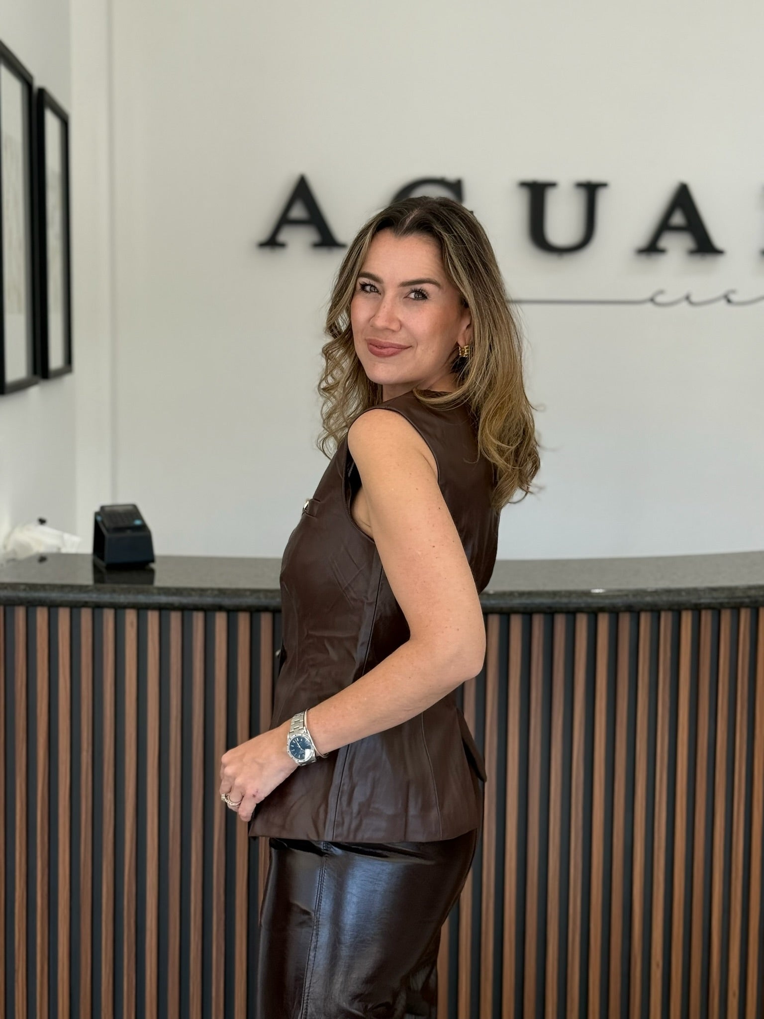 Chaleco de acabado tipo piel en tono chocolate con botones dorados. Su corte estructurado realza la figura y aporta un toque moderno y sofisticado.