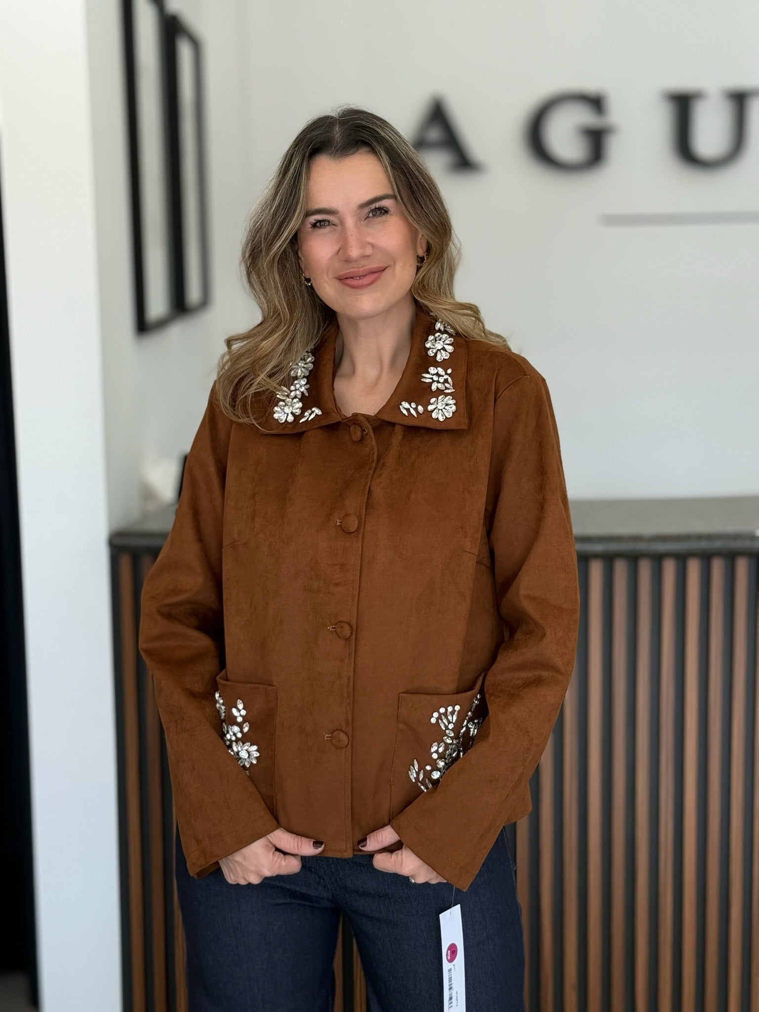 Chaqueta tipo gamuza con aplicaciones florales de pedrería en cuello y bolsillos frontales. Su diseño combina textura suave con detalles brillantes que elevan cualquier look casual o boho.