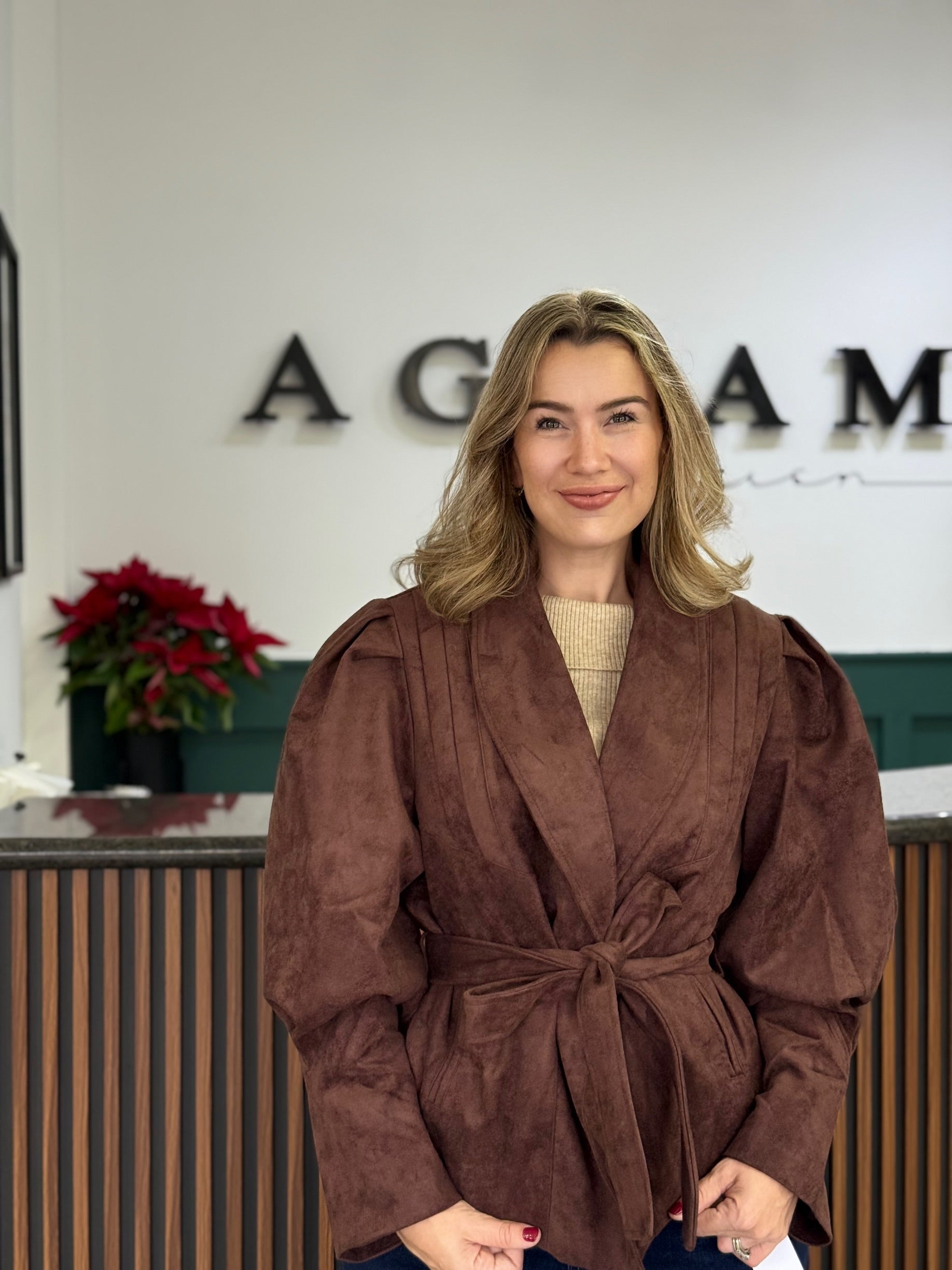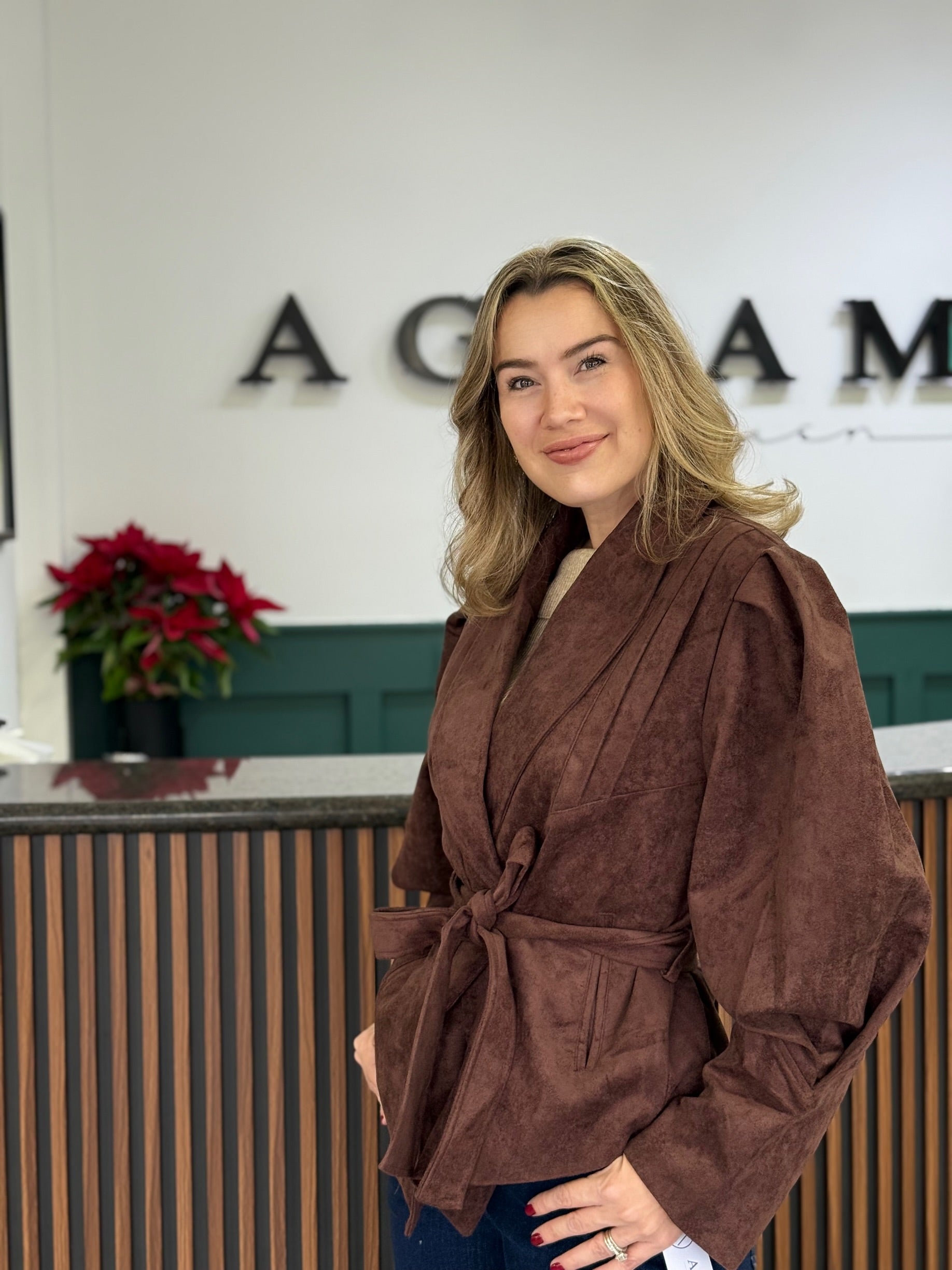Chaqueta tipo suede con caída suave, pliegues al frente y cinturón ajustable. Ideal para looks de temporada con un toque moderno y pulido.