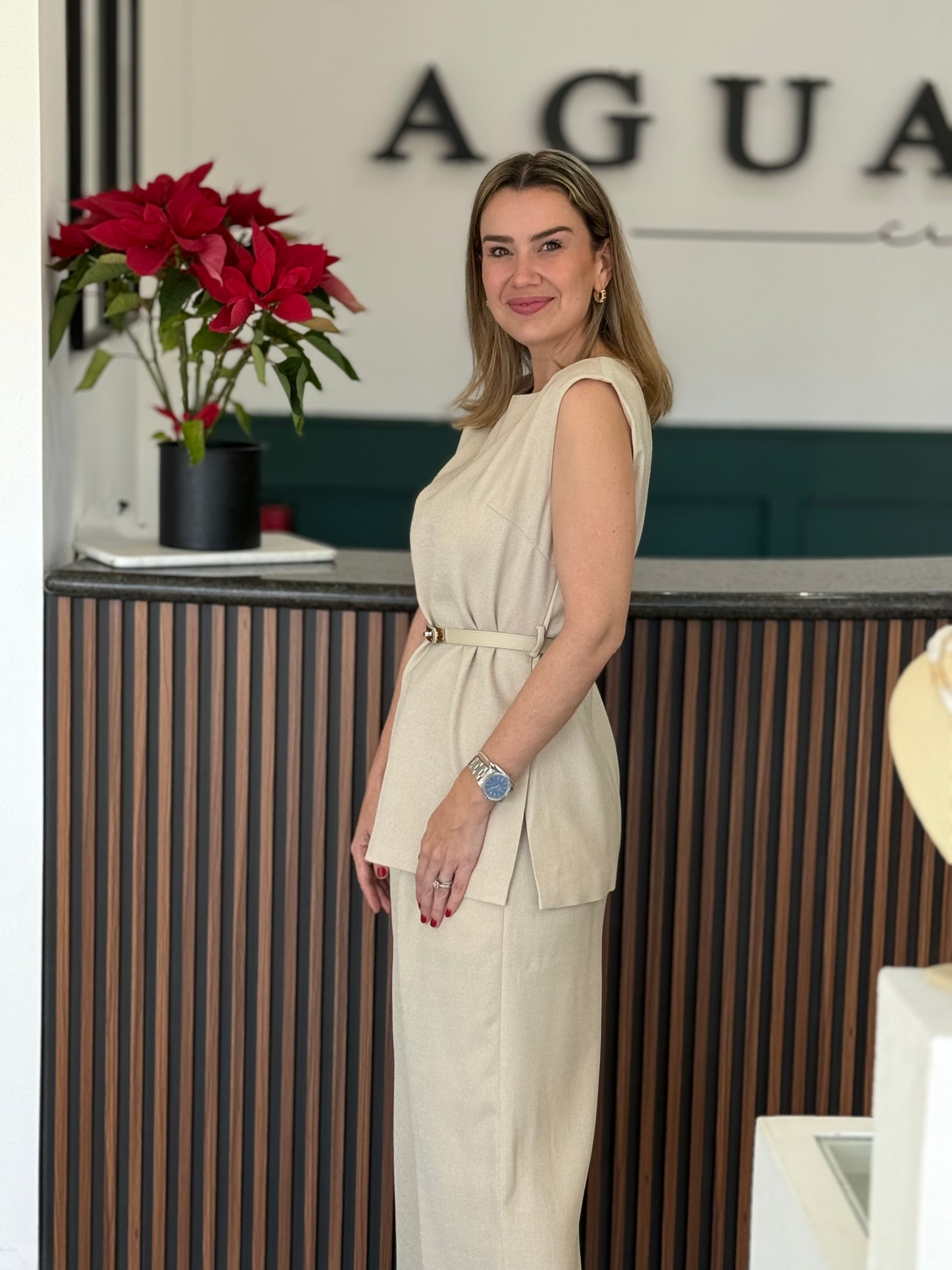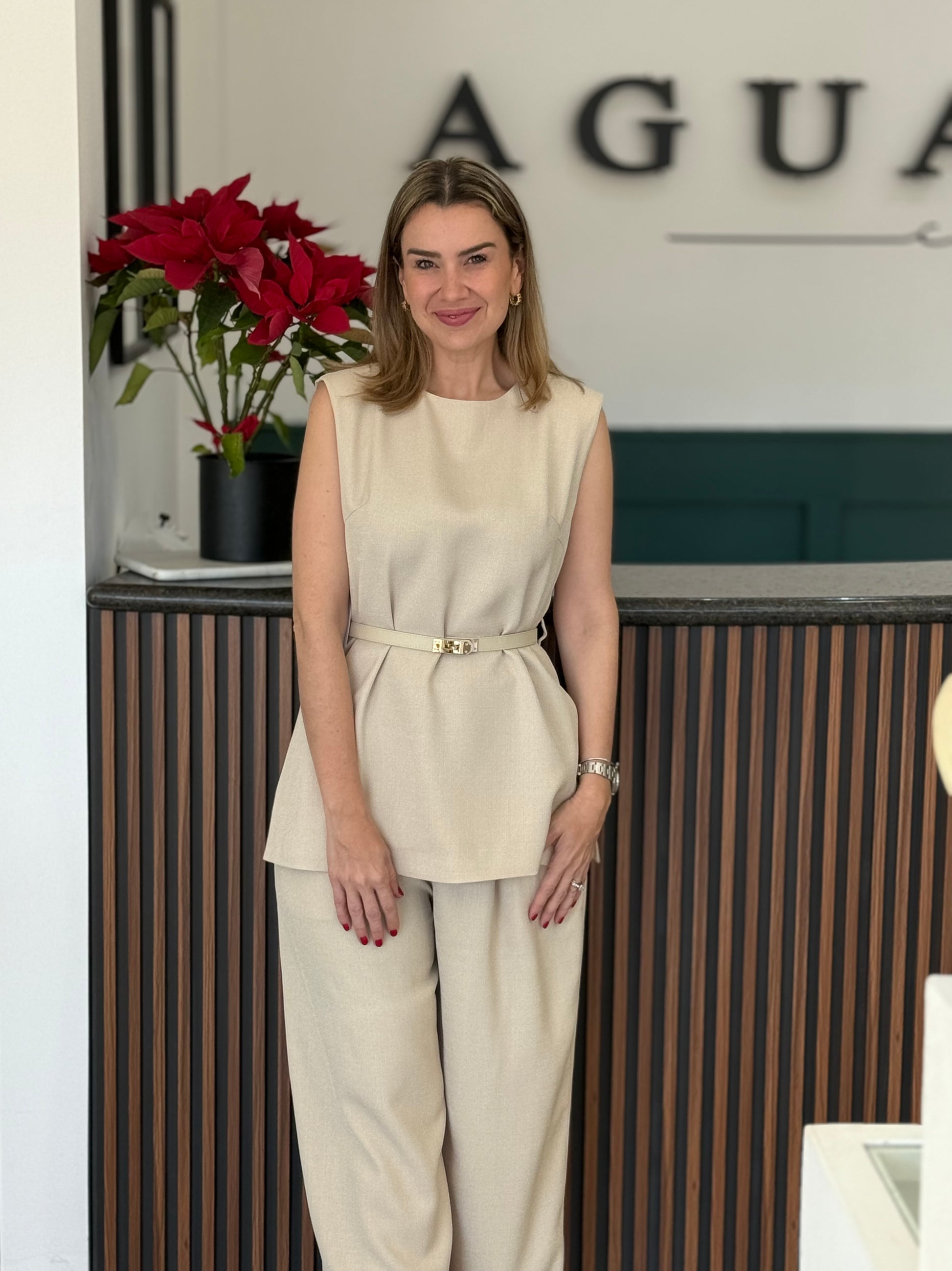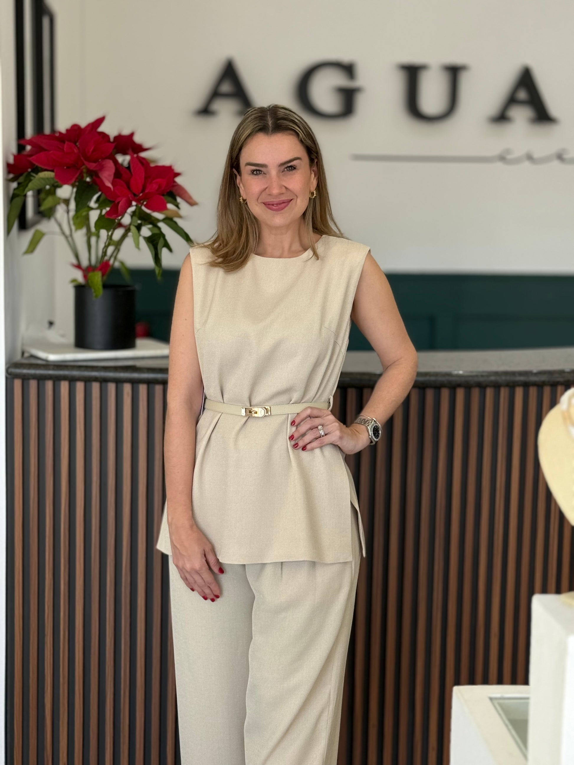 Conjunto de dos piezas con top estructurado sin mangas y pantalón de pierna amplia. Limpio, sofisticado y muy fácil de estilizar para looks formales o effortless chic.