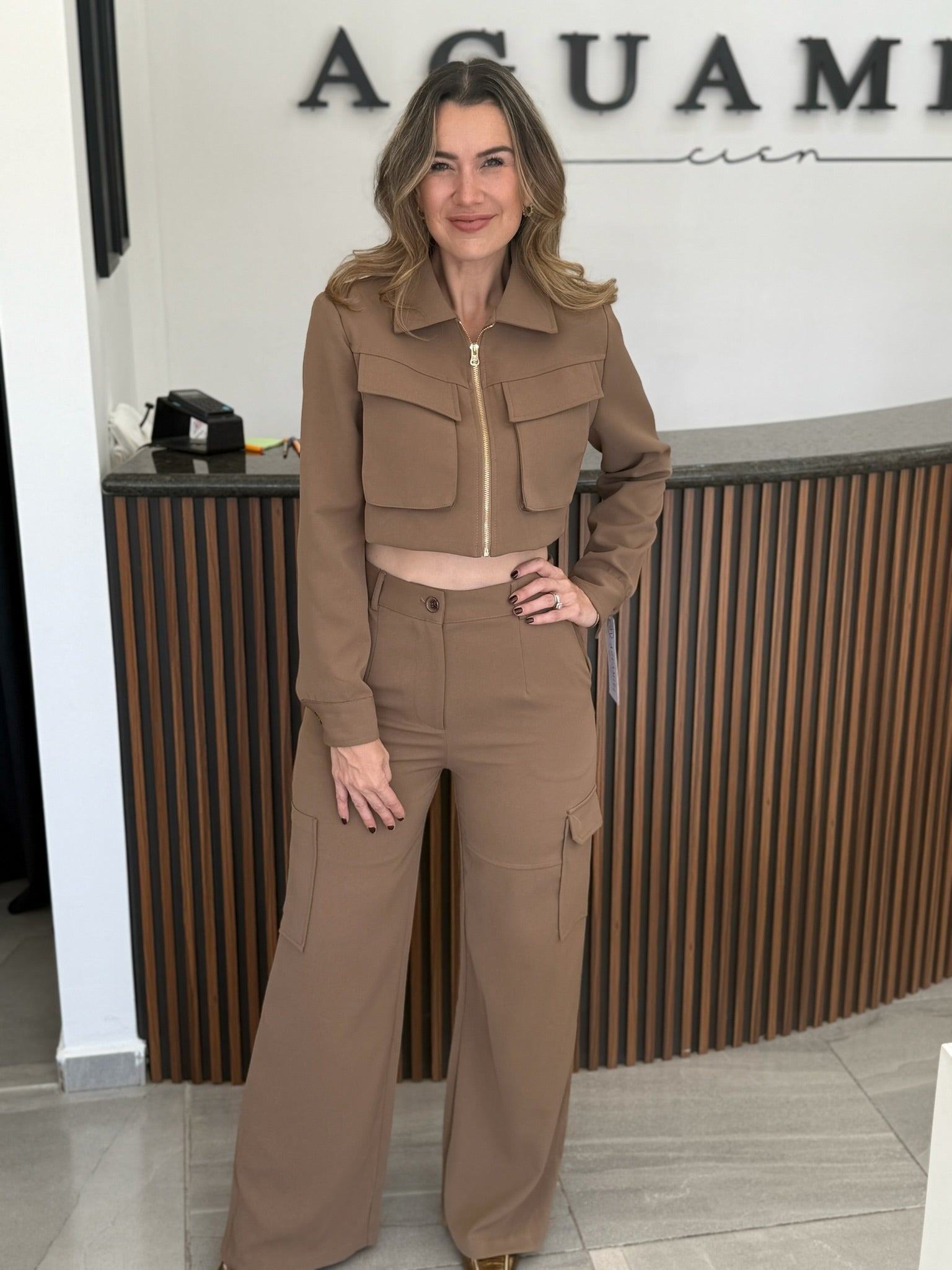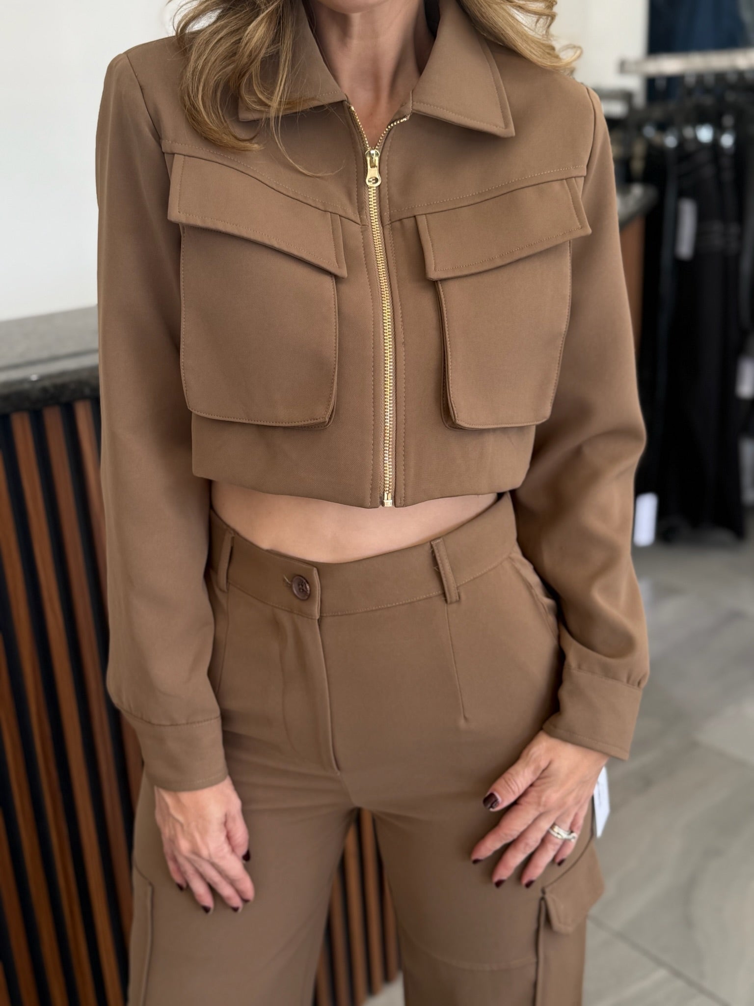 Conjunto tipo sastre con cierre frontal dorado y bolsillos cargo. Incluye chaqueta corta estructurada y pantalón de pierna ancha. Su estilo utilitario moderno lo hace ideal para looks casuales con un toque sofisticado.