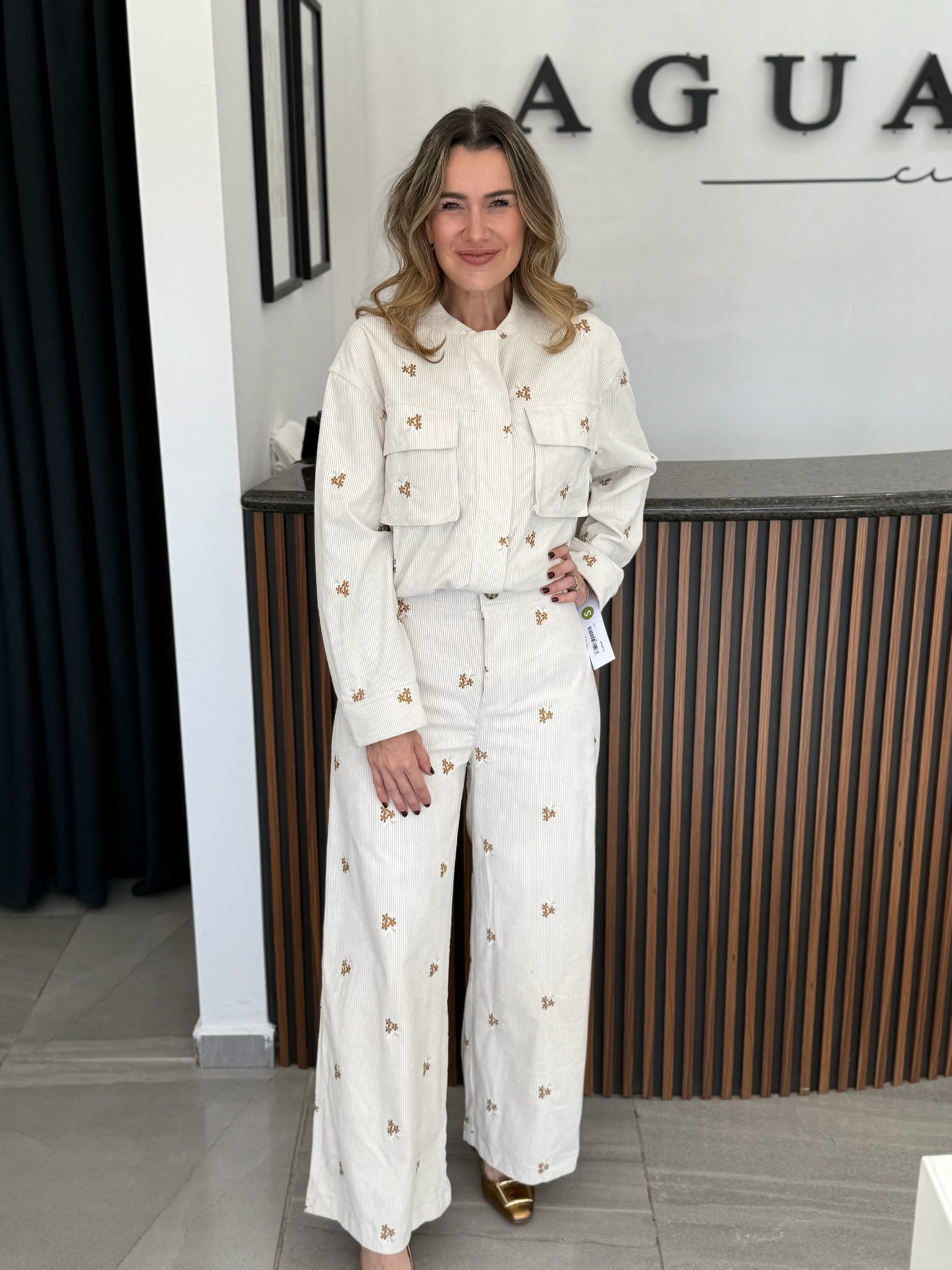 Conjunto en pana color crema con bordados florales tono miel. Chaqueta tipo bomber con bolsillos amplios y pantalón de pierna ancha. Un look femenino y cálido con toque artesanal.