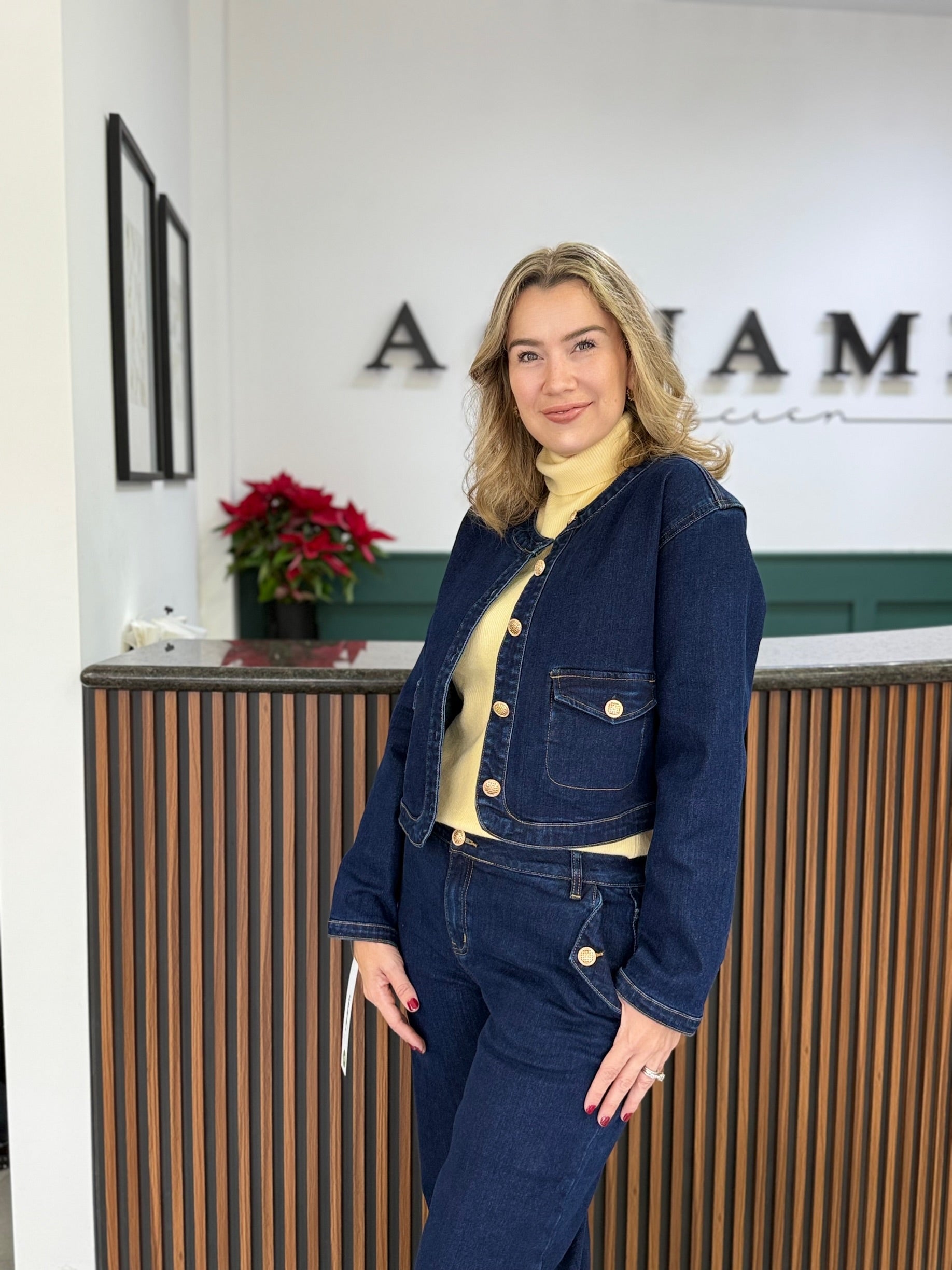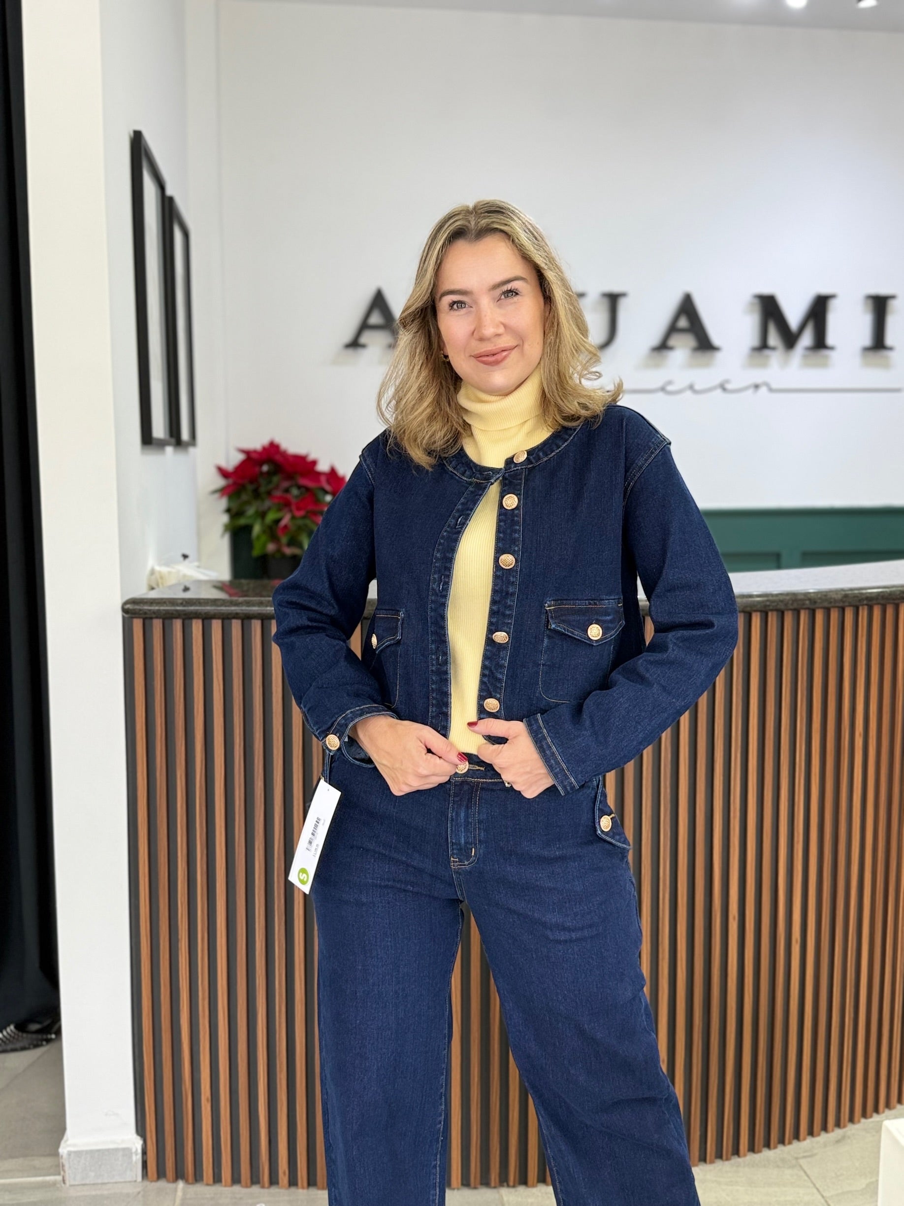 Set de mezclilla en tono índigo con acabado estructurado y botones dorados tipo joya. La chaqueta tiene corte recto y bolsillos al frente; el pantalón es recto y croppped para un look moderno y pulido. Una combinación clásica que eleva cualquier outfit.