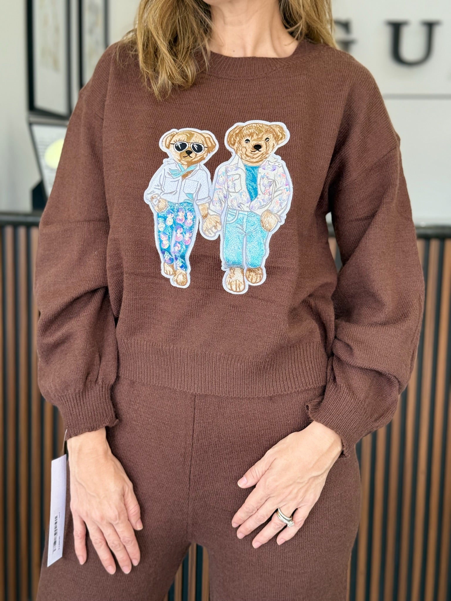 conjunto que combina comodidad y un toque divertido. Suéter de punto con pantalón a juego y aplicaciones bordadas de ositos con detalles de lentejuelas que le dan un brillo especial. Perfecto para looks casuales y relajados, sin perder el estilo.