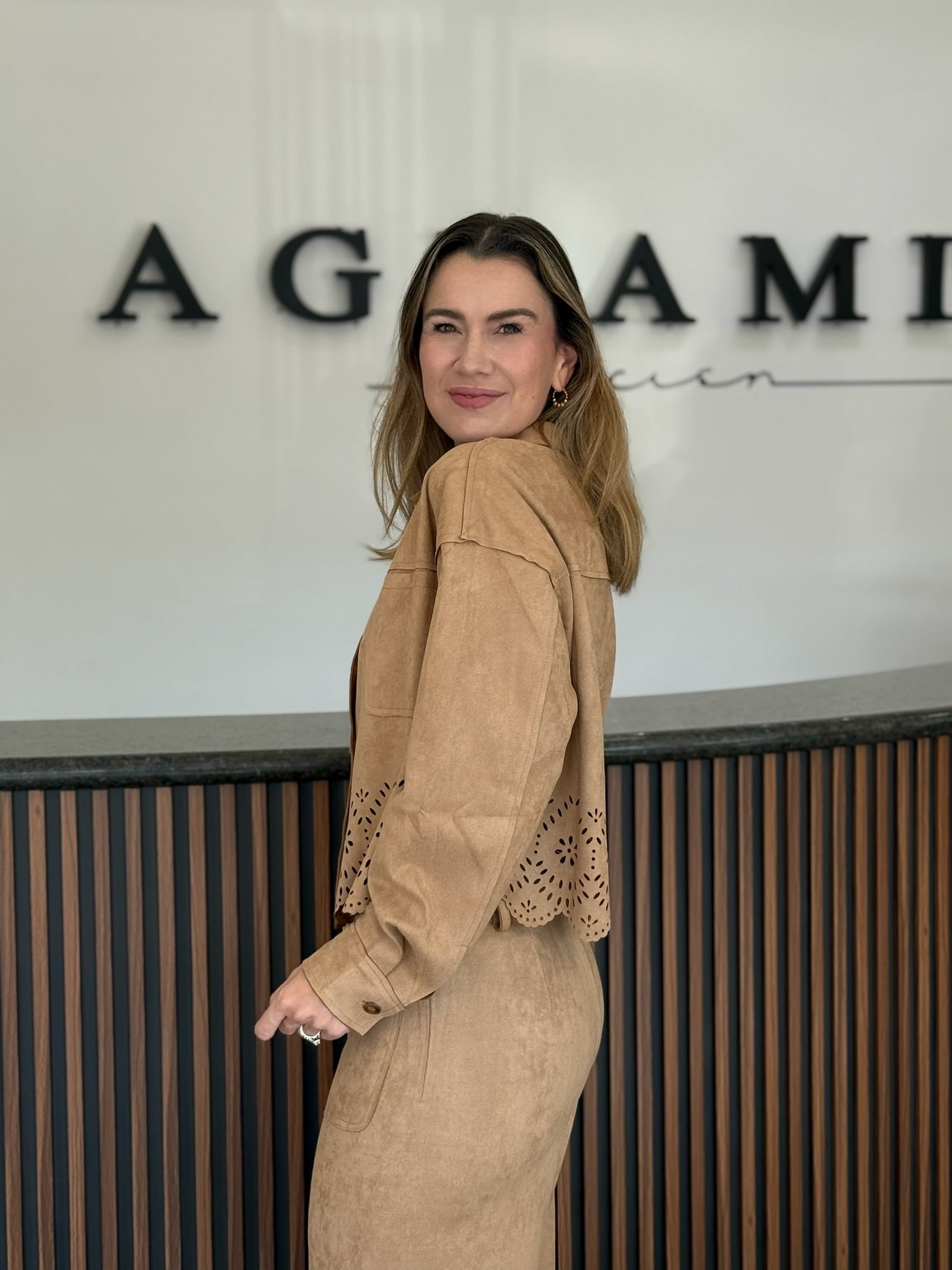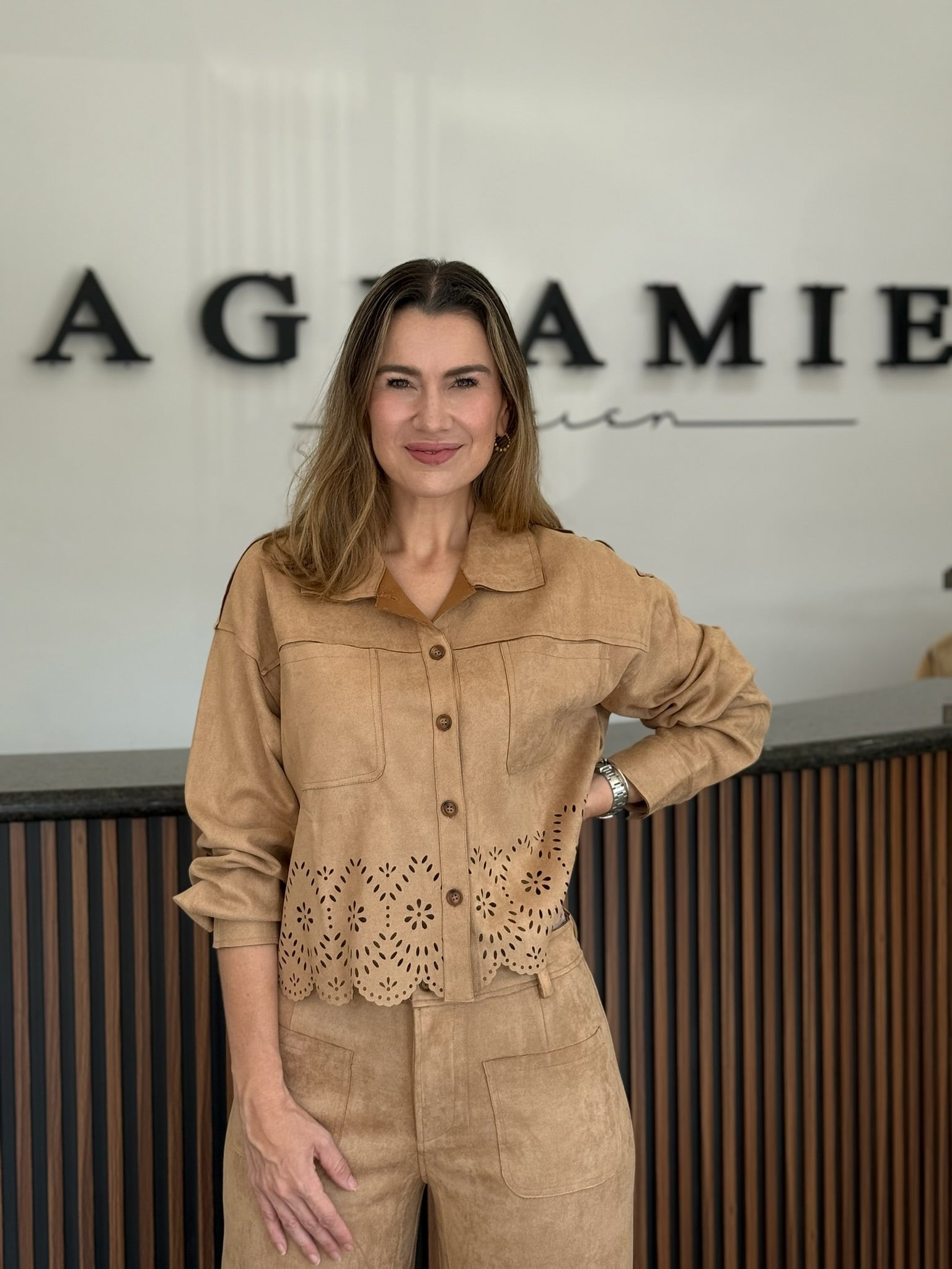 Conjunto de dos piezas en textura tipo gamuza con cortes láser. Incluye chaqueta tipo camisa con detalles calados y pantalón de pierna amplia. Su tacto suave y diseño estructurado lo convierten en una opción moderna, cómoda y con un aire sofisticado para esta temporada.