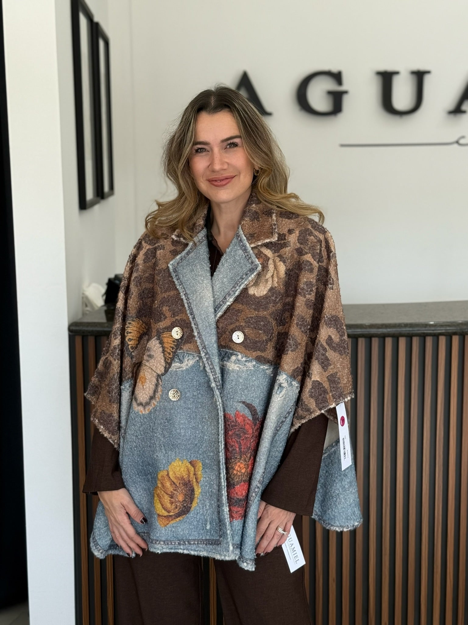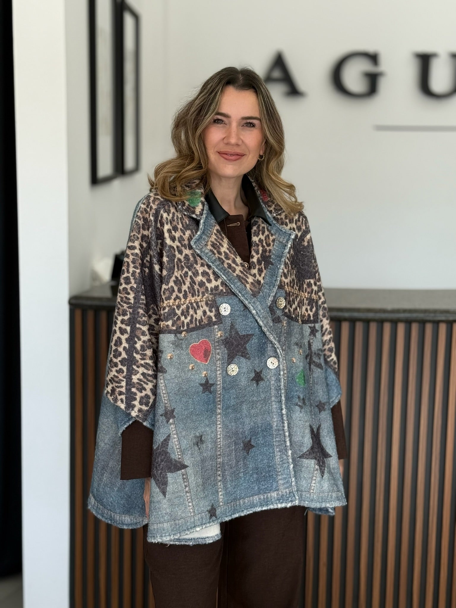 Abrigo tipo ensamble con mezcla de texturas y estampados: denim, animal print y flores bordadas. Su diseño estructurado con botones metálicos crea un contraste único entre lo bohemio y lo moderno. Perfecto para destacar en looks otoñales o invernales con personalidad