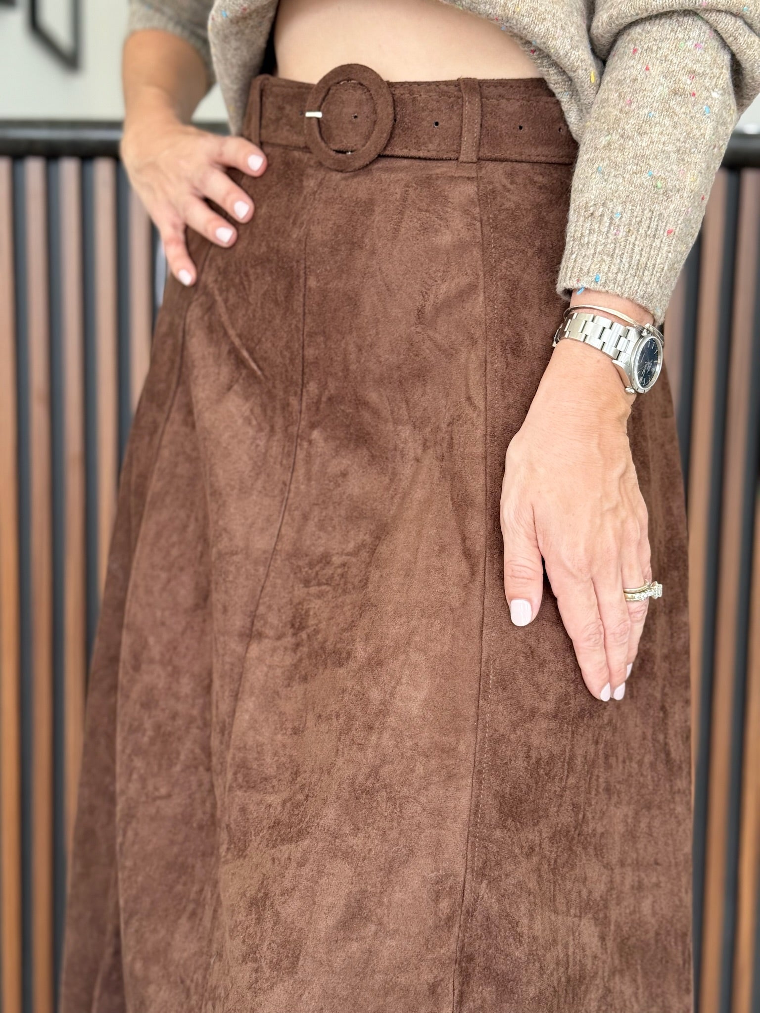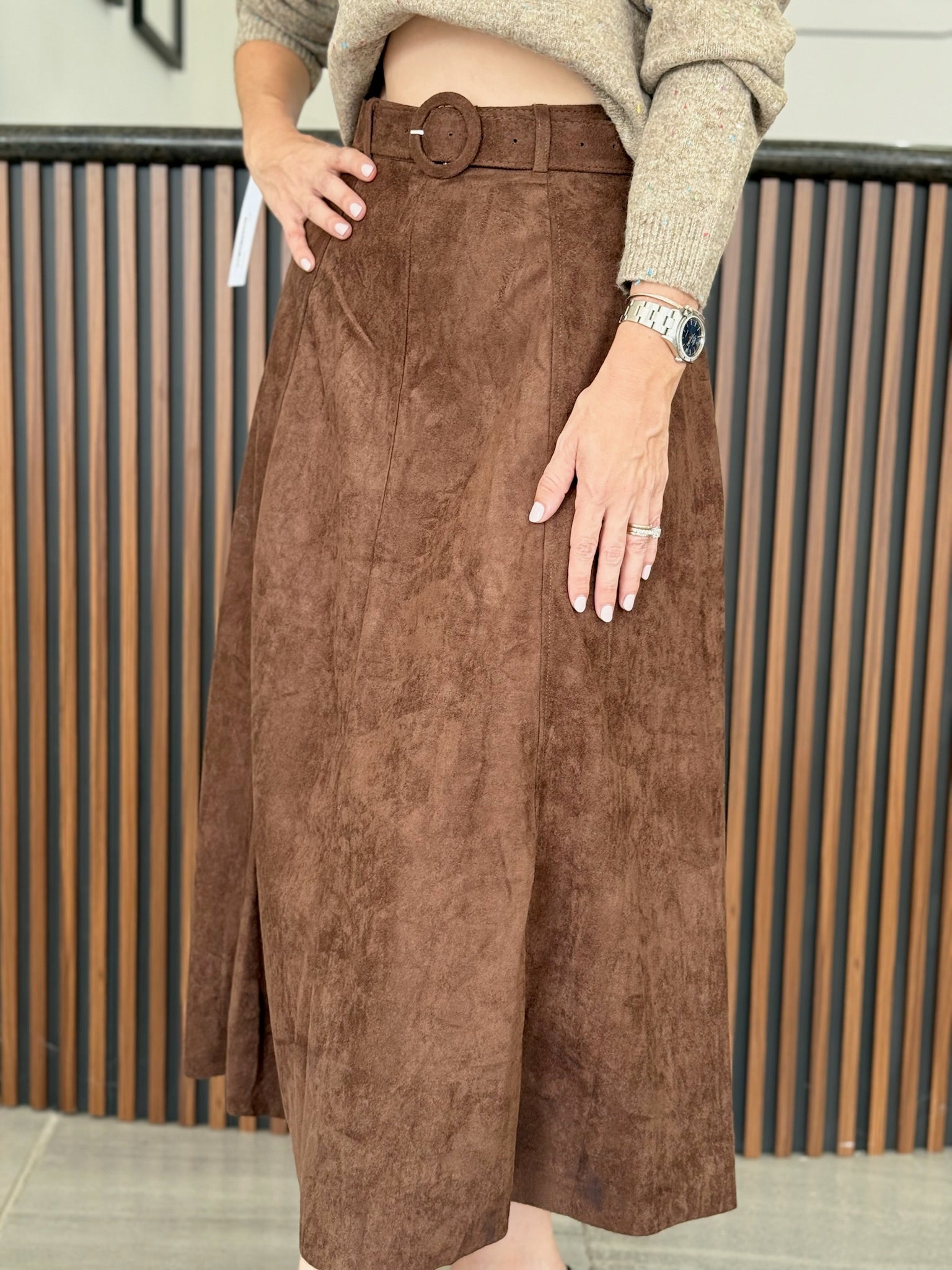 Falda midi en gamuza sintética con cinturón al tono. Diseño estructurado, suave al tacto y con caída ligera que estiliza la silueta. Ideal para combinar con suéteres o blusas ajustadas.