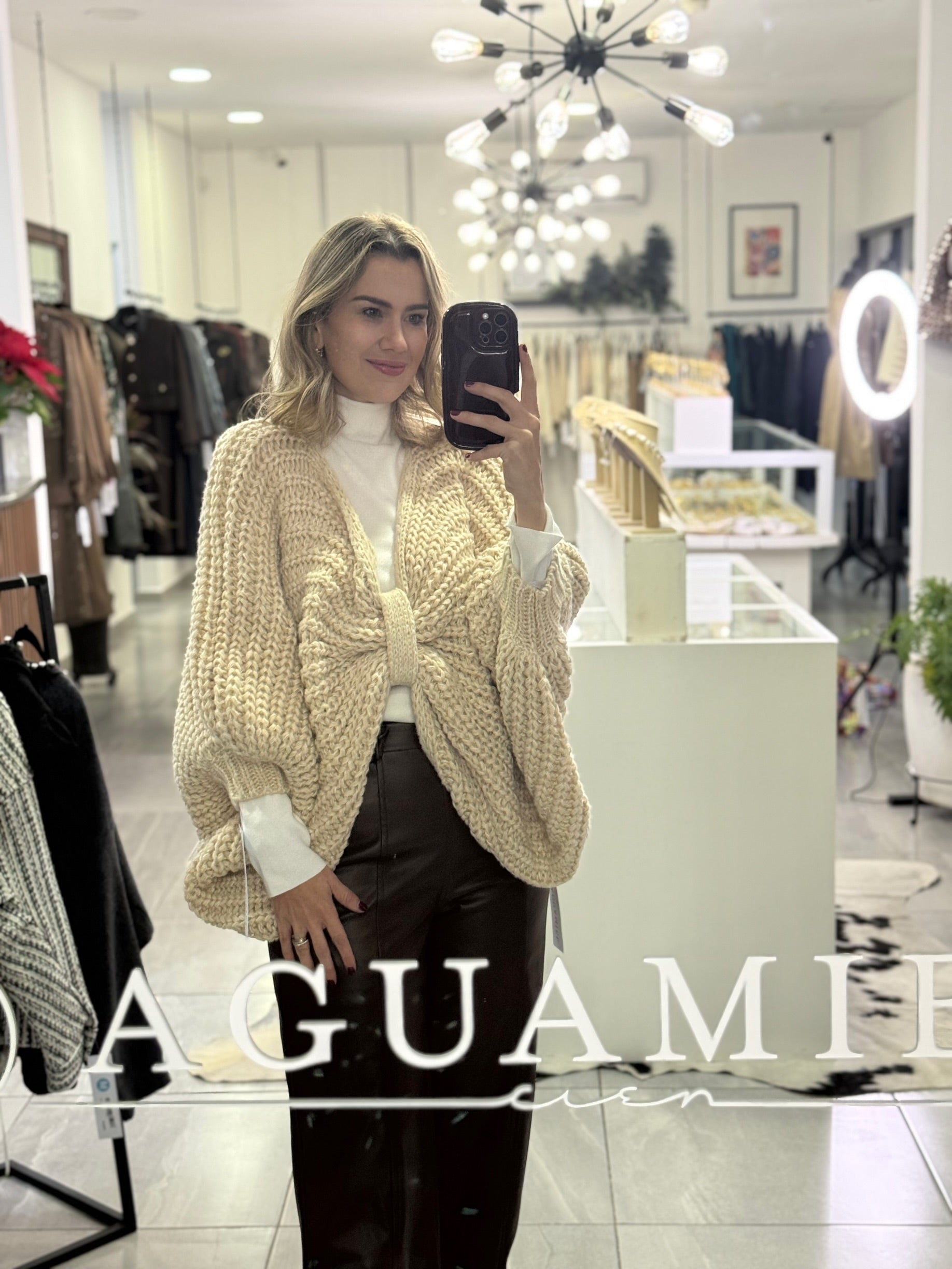 Poncho tejido de punto grueso con diseño tipo moño al frente. Suave, ligero y perfecto para elevar cualquier look de invierno sin esfuerzo.