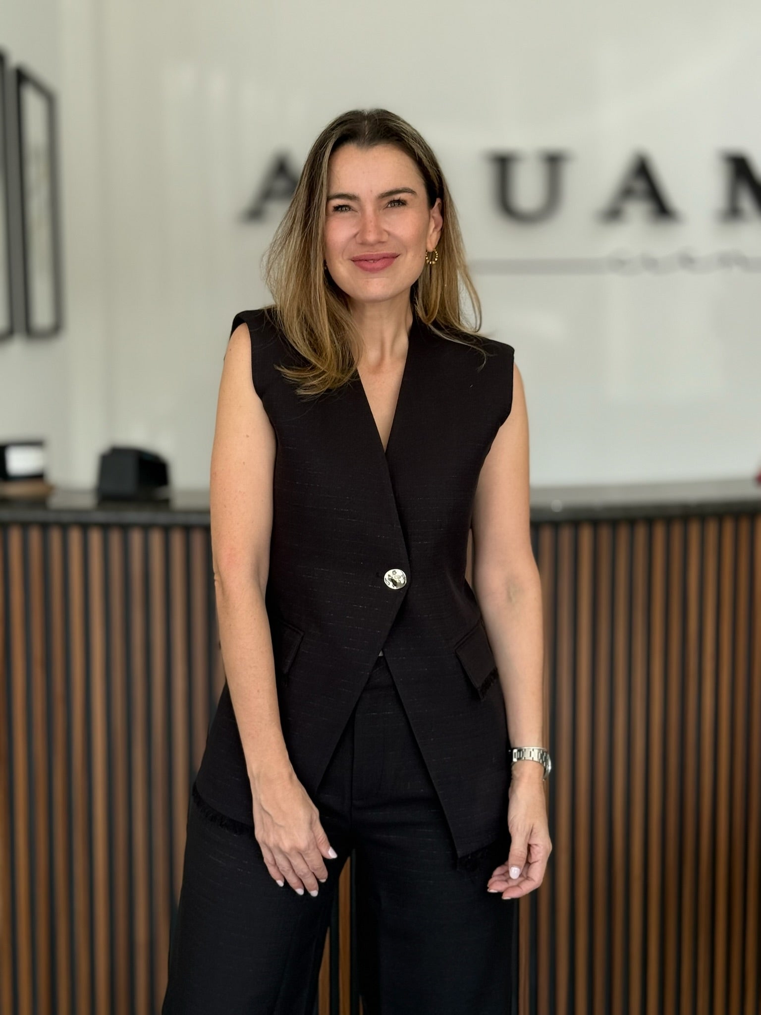 Set de dos piezas en color negro con chaleco largo estructurado y pantalón de pierna ancha. Un conjunto elegante y moderno que combina fuerza y estilo, ideal para juntas, cenas o eventos de temporada.
