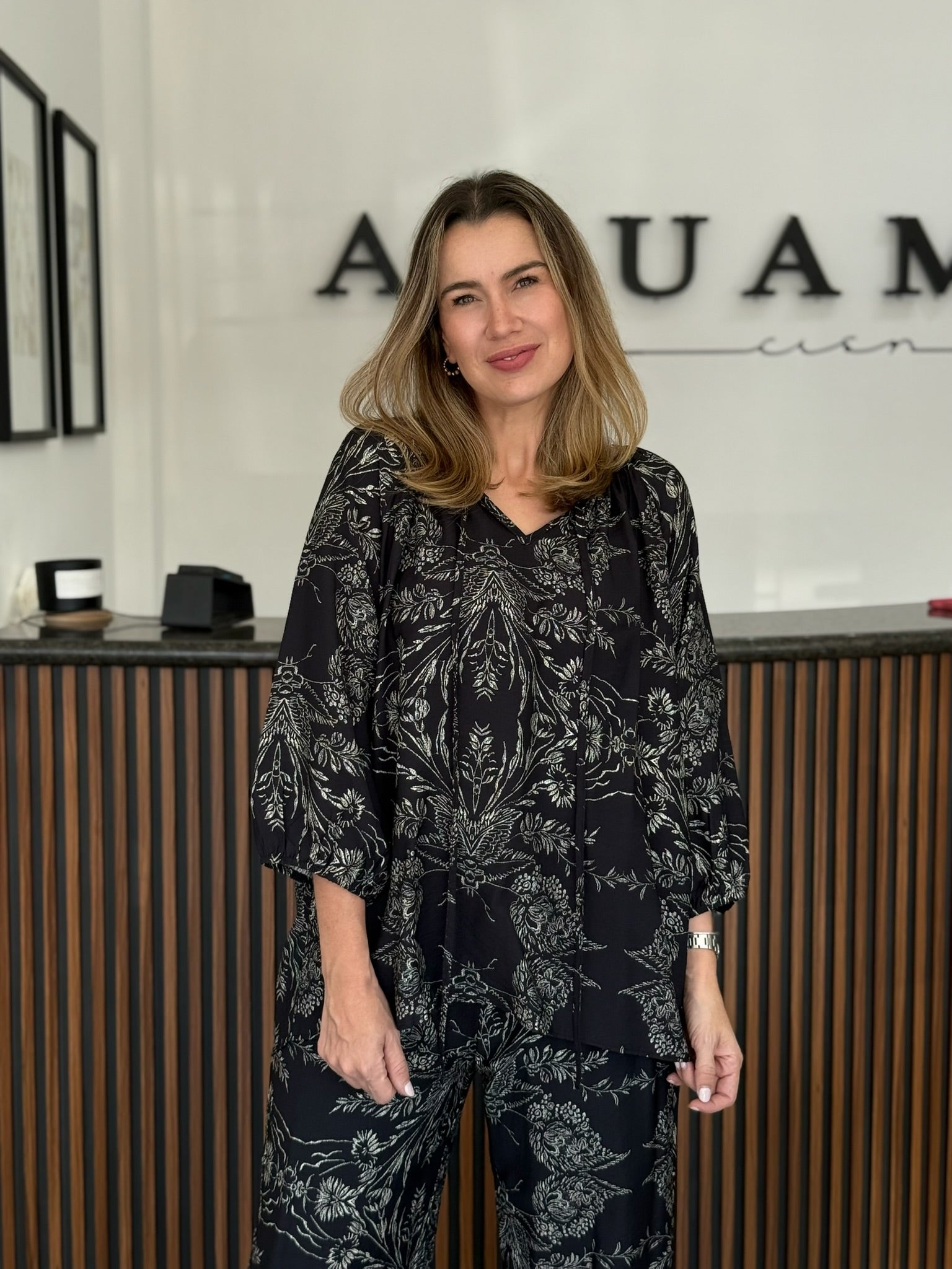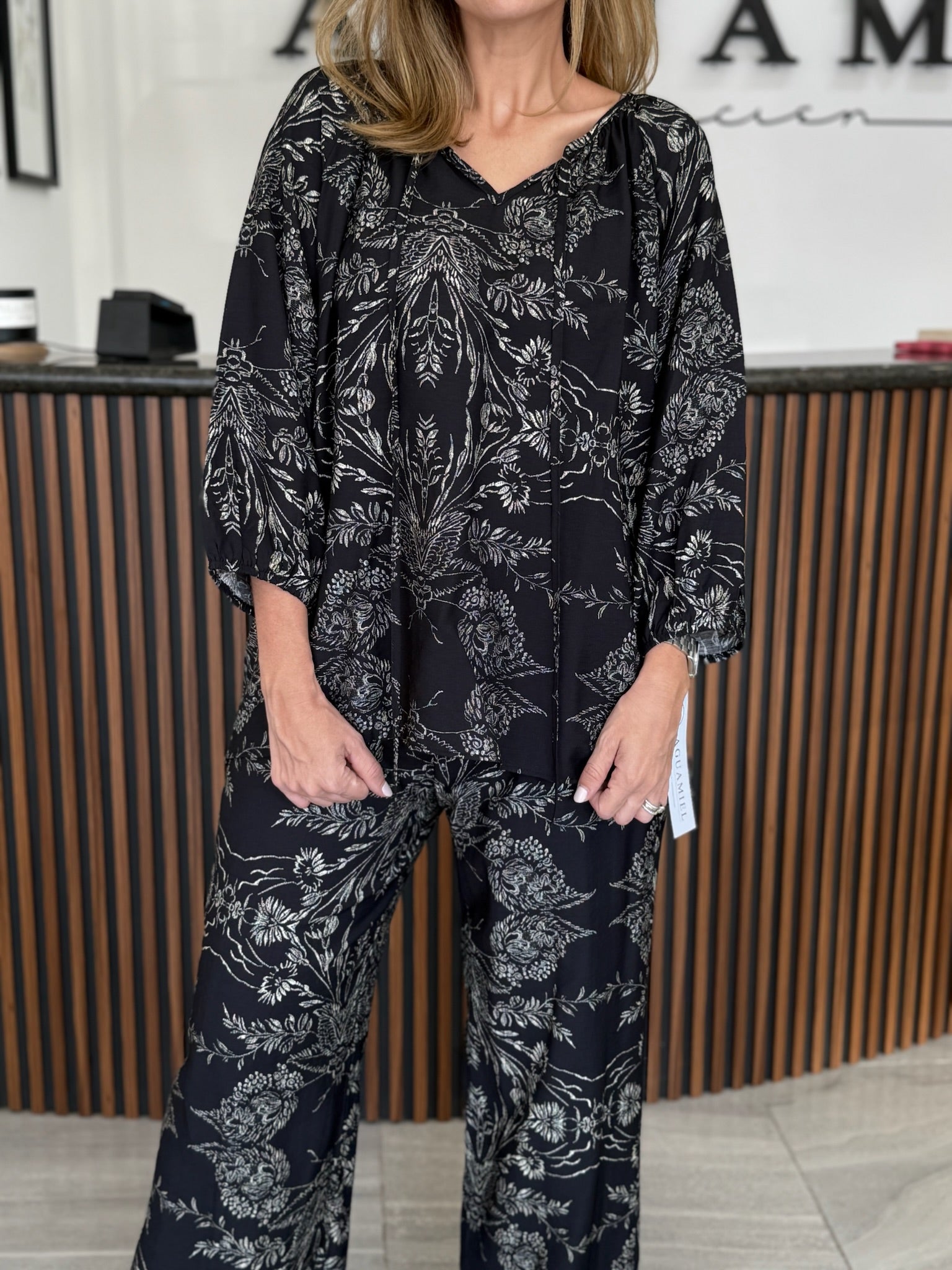 Set de dos piezas en fondo azul marino con estampado botánico. Blusa de manga amplia y pantalón recto de caída suave. Un conjunto cómodo y elegante para cualquier ocasión.