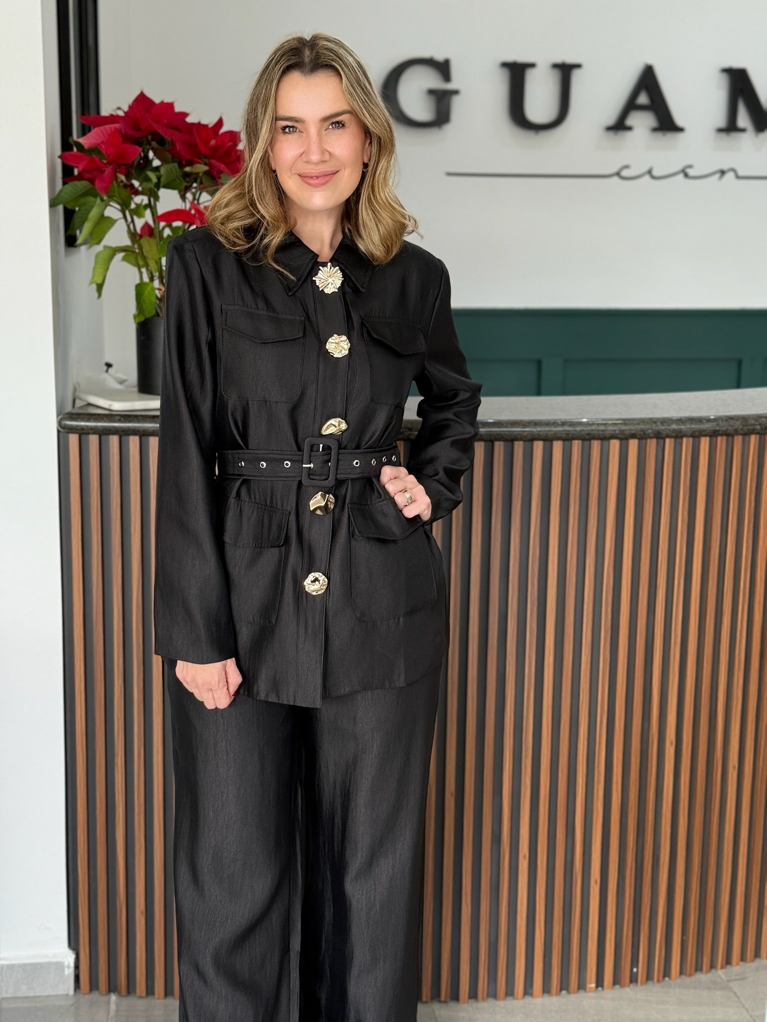 Conjunto de chaqueta estructurada con botones dorados y pantalón recto. Un set imponente que define la figura y aporta presencia en cada ocasión.