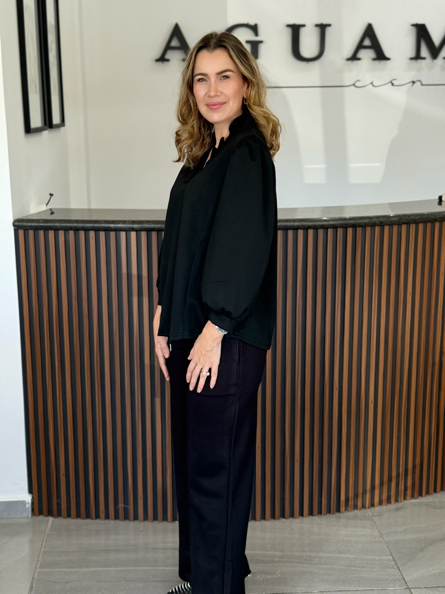 Set de dos piezas con blusa de volantes en el escote y pantalón fluido. Corte relajado y cómodo, ideal para look casual o de oficina.