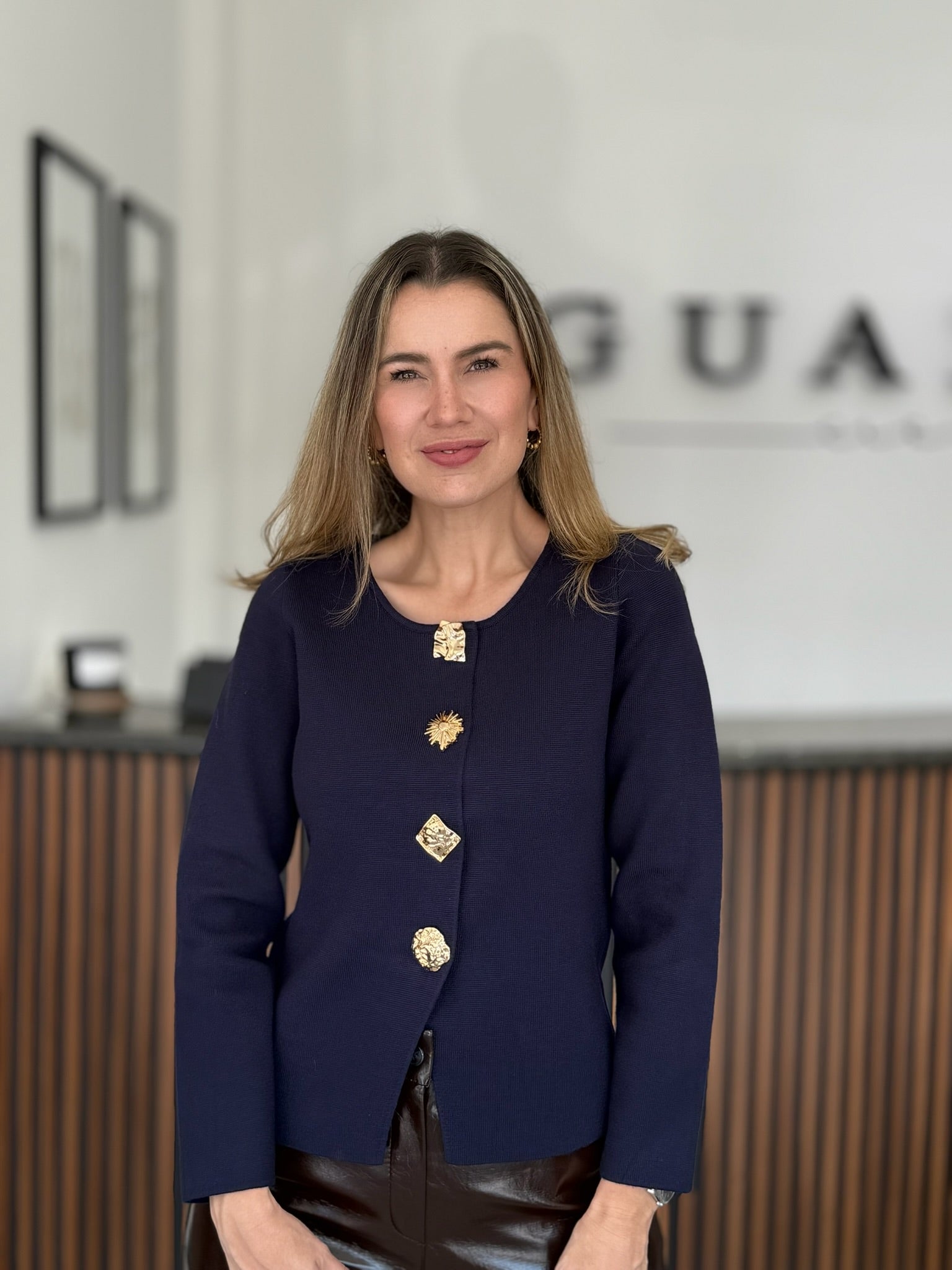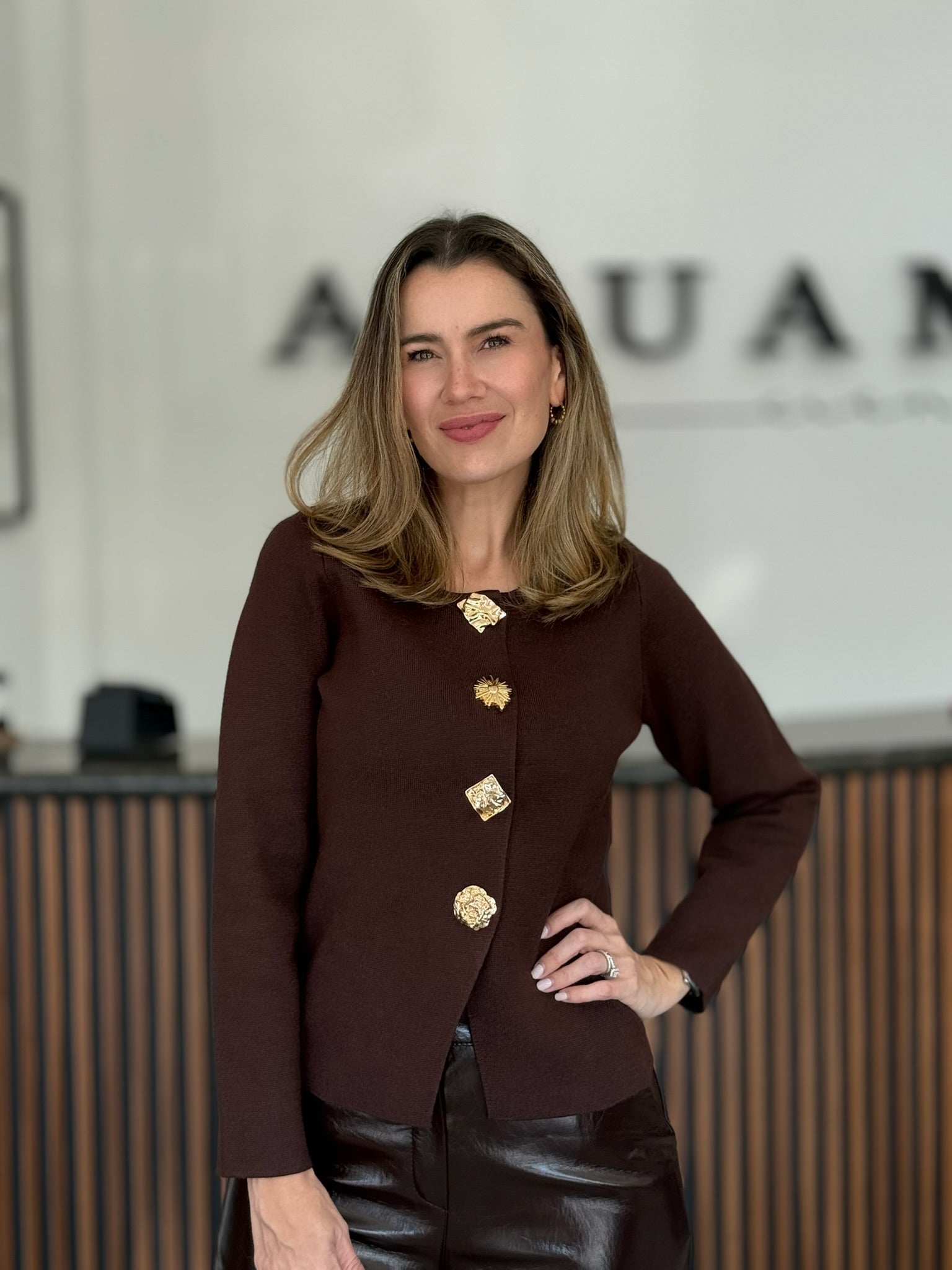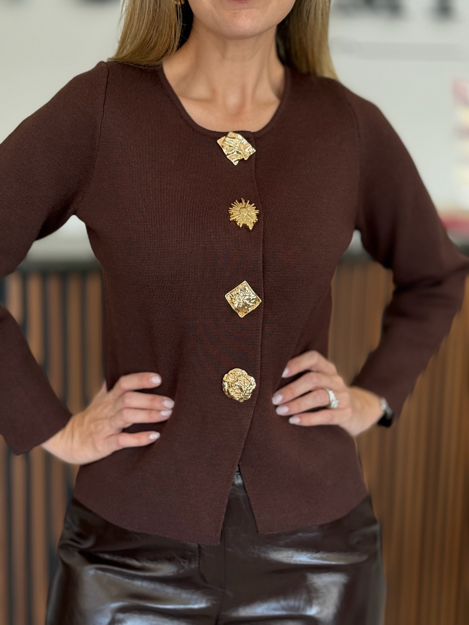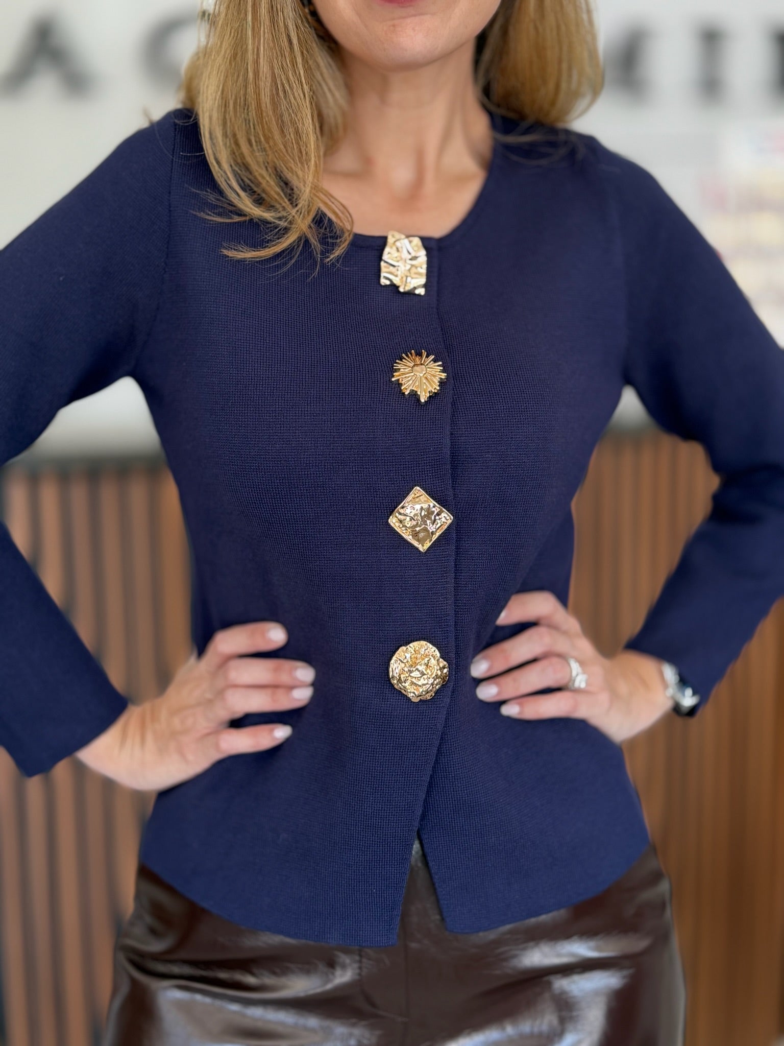 Suéter azul marino y café con botones dorados al frente. De textura suave y corte recto, perfecto para elevar tus looks de oficina o salidas casuales.