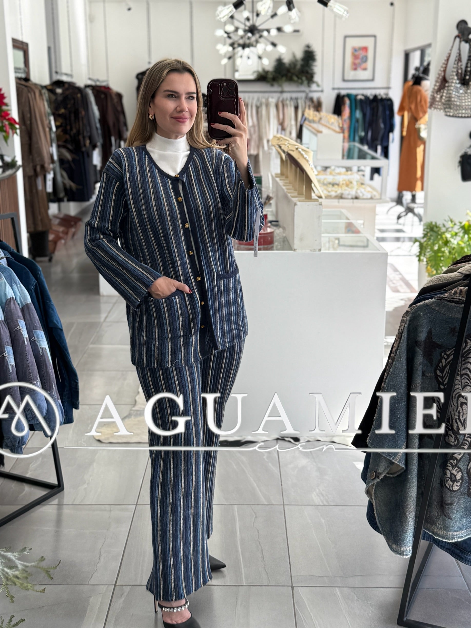 Set tejido de dos piezas con diseño de líneas y botones al frente. Suave, cómodo y con caída ligera para un look moderno y diferente.