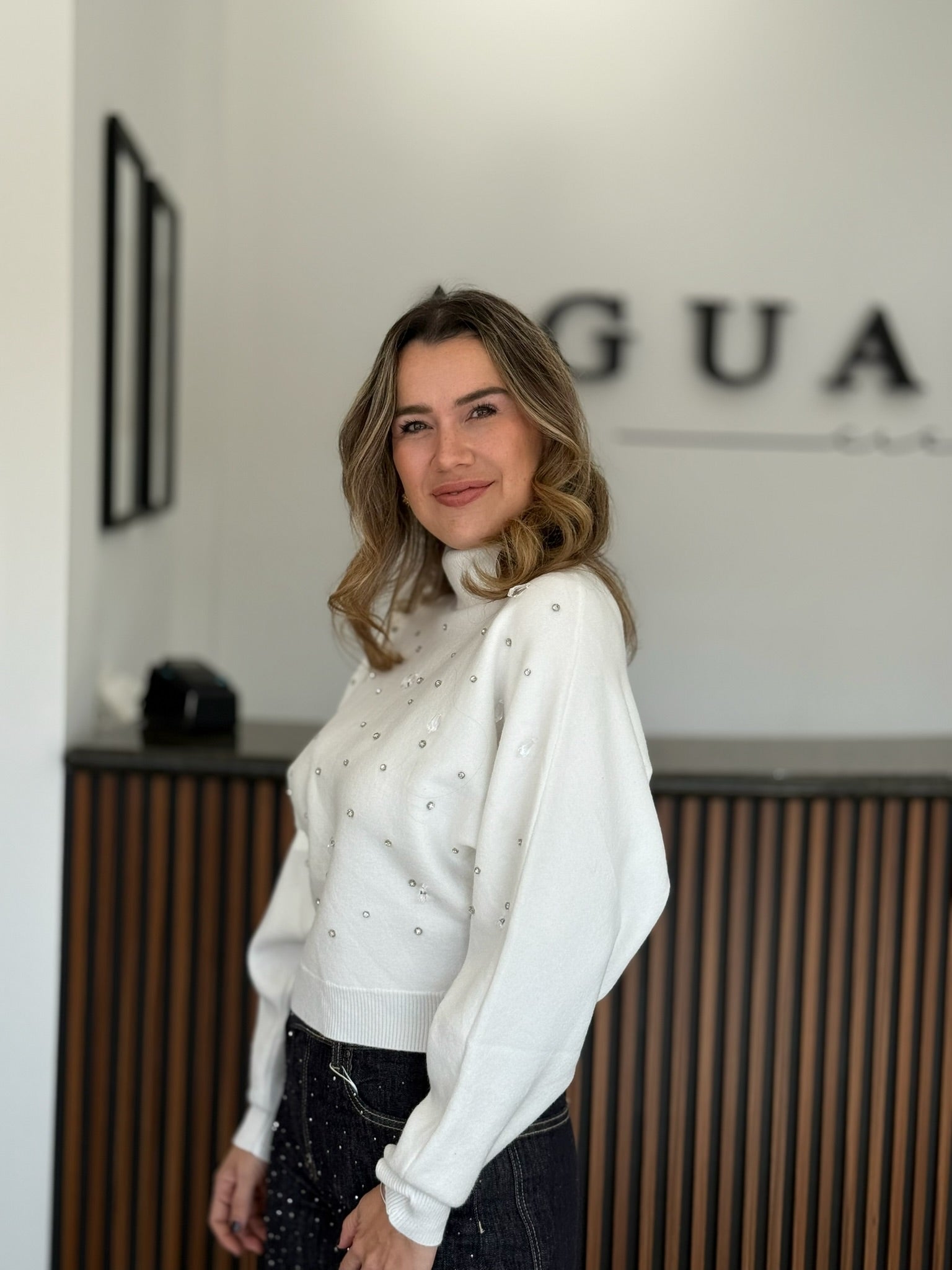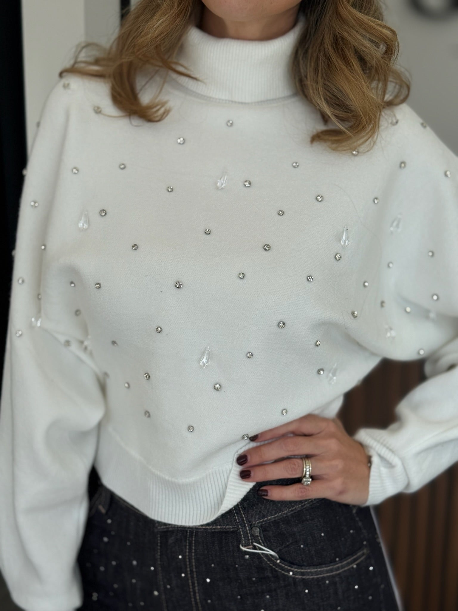 Suéter blanco de cuello alto con aplicaciones de pedrería. Su textura suave y ligera lo hace perfecto para combinar con mezclilla o faldas en looks invernales luminosos.