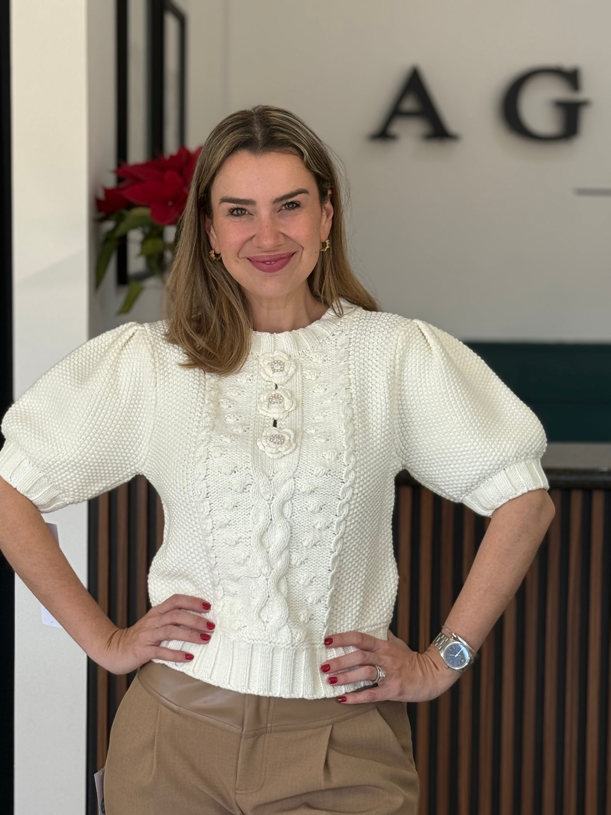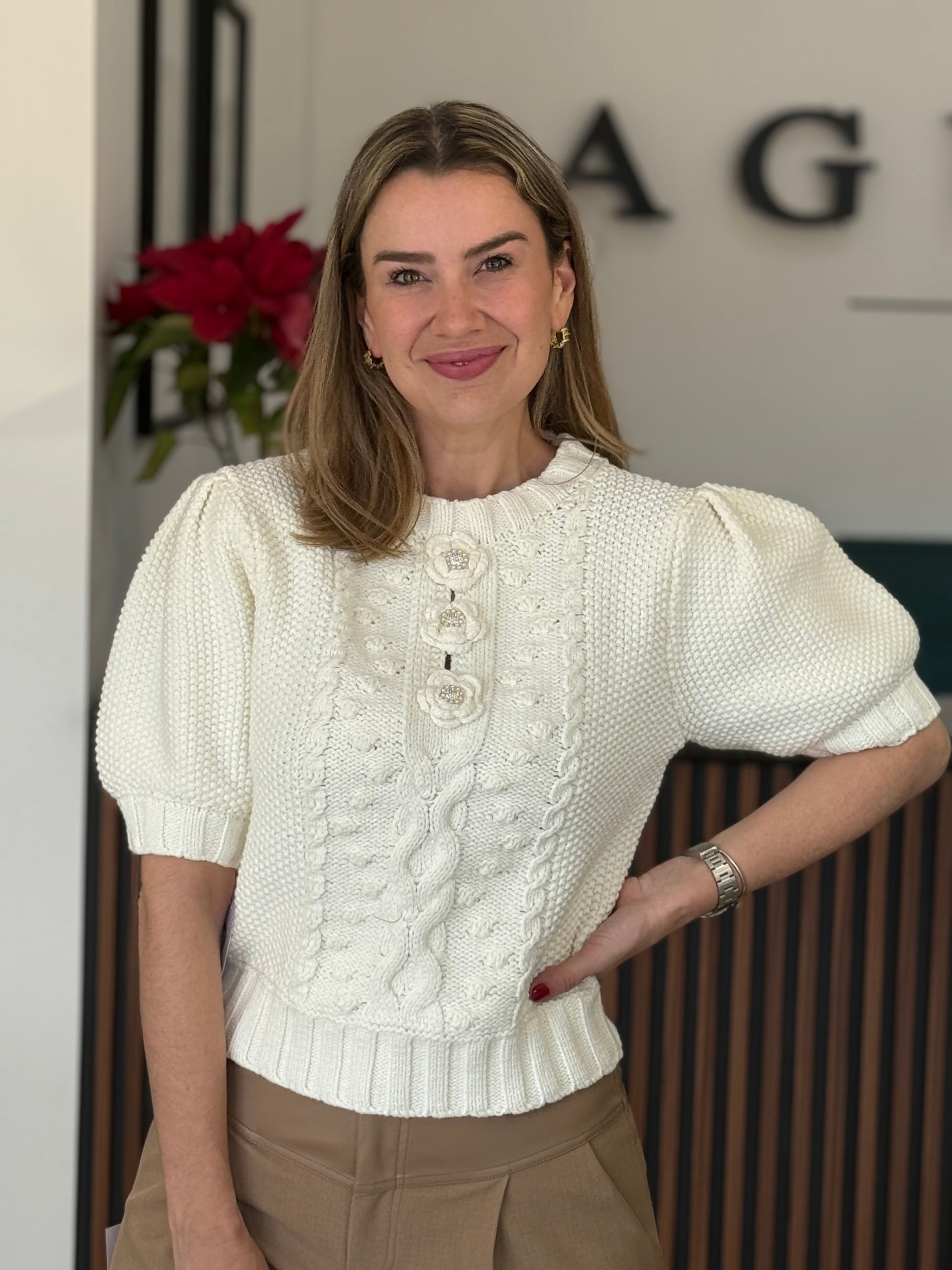 Suéter de tejido fino con detalles en relieve y manga corta. Una pieza especial que eleva cualquier look sin perder comodidad.