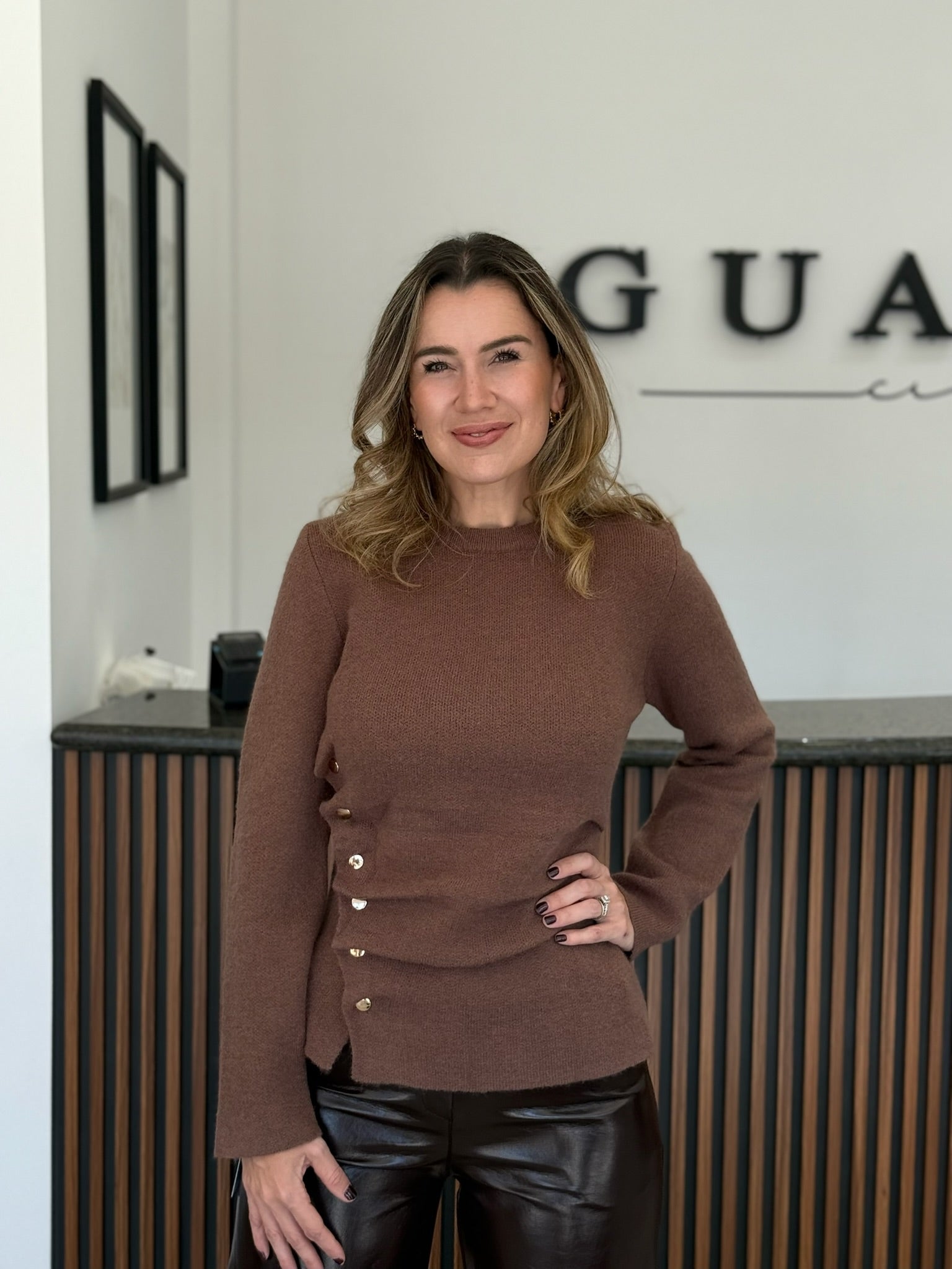 Suéter de punto fino en tono café, con detalle de botones al costado y manga ligeramente acampanada. Ideal para un look casual con un toque femenino.