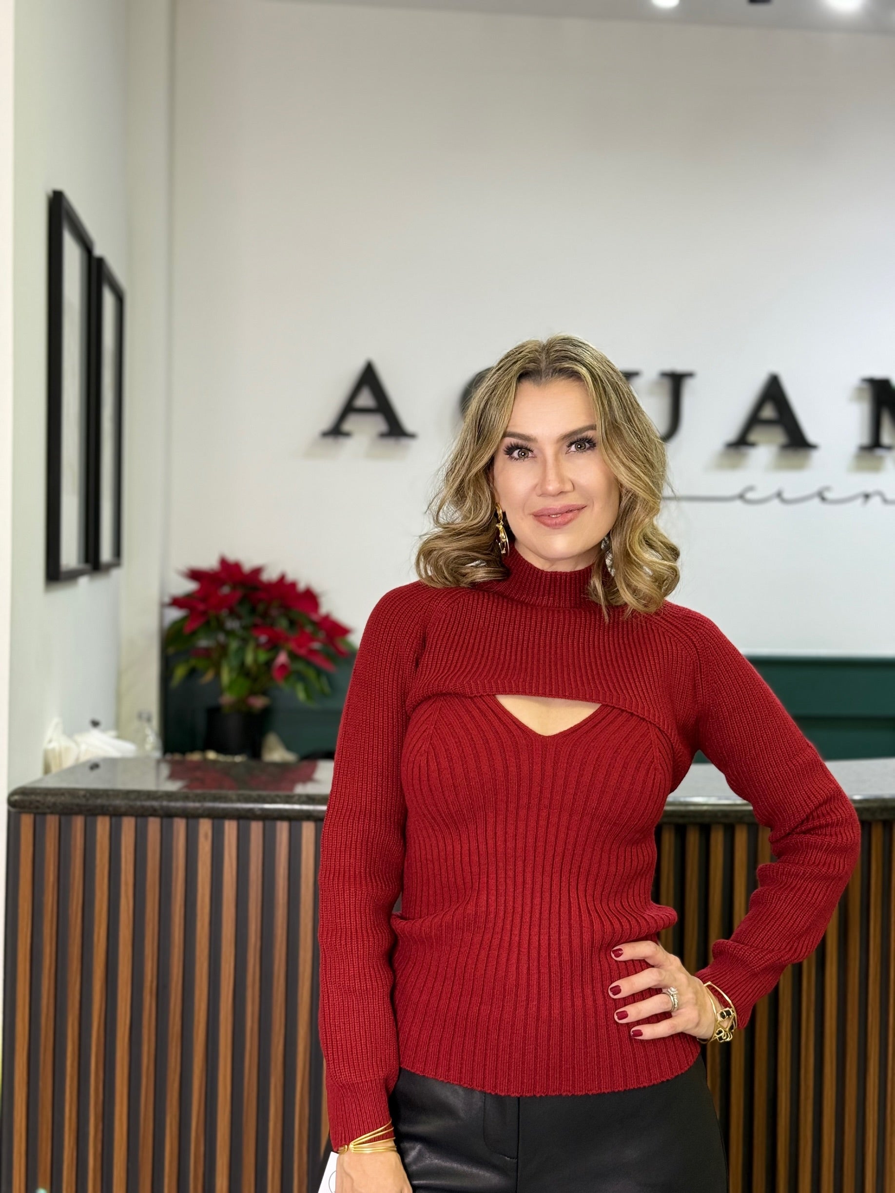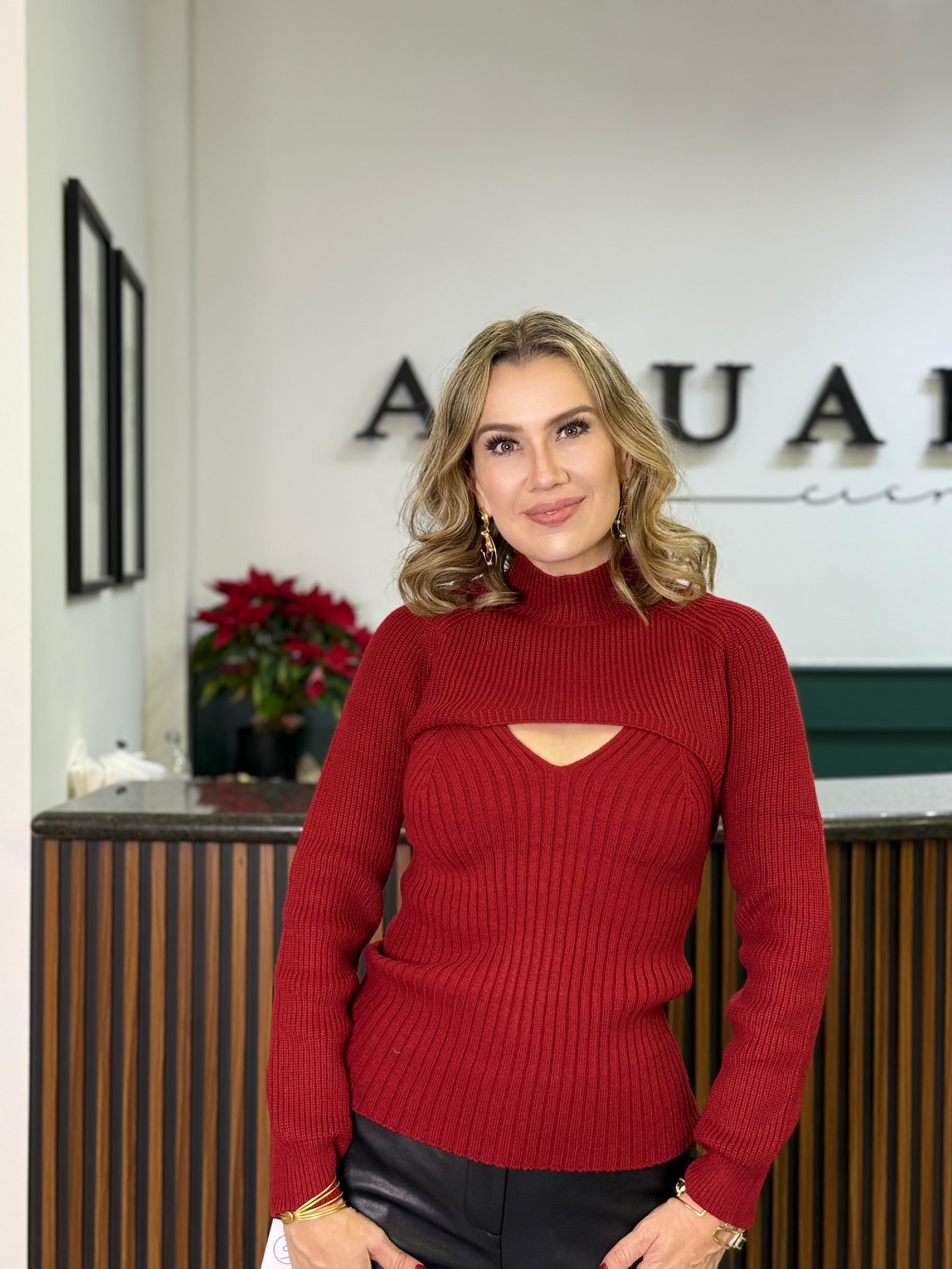 Suéter tejido de corte ajustado en tono rojo, con detalle cut-out en el escote que aporta un toque moderno y femenino. Ideal para looks casuales y chic.