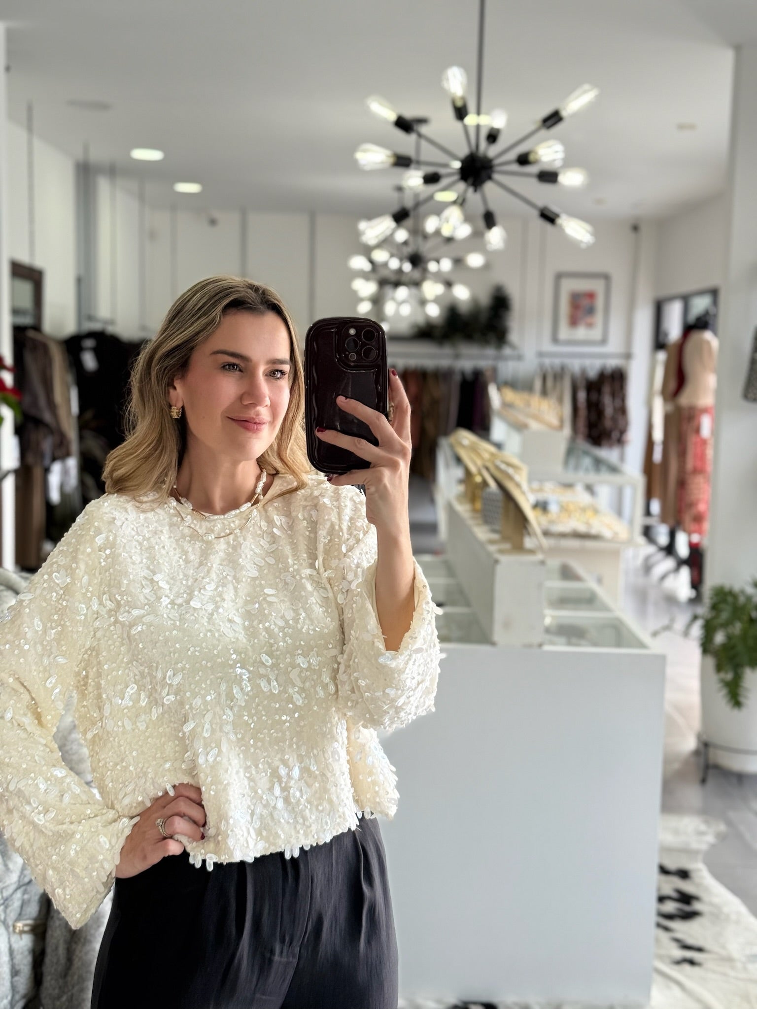 Suéter texturizado con aplicación de lentejuela fina que aporta brillo sutil y un acabado de lujo. Perfecto para un look festivo con toque delicado.