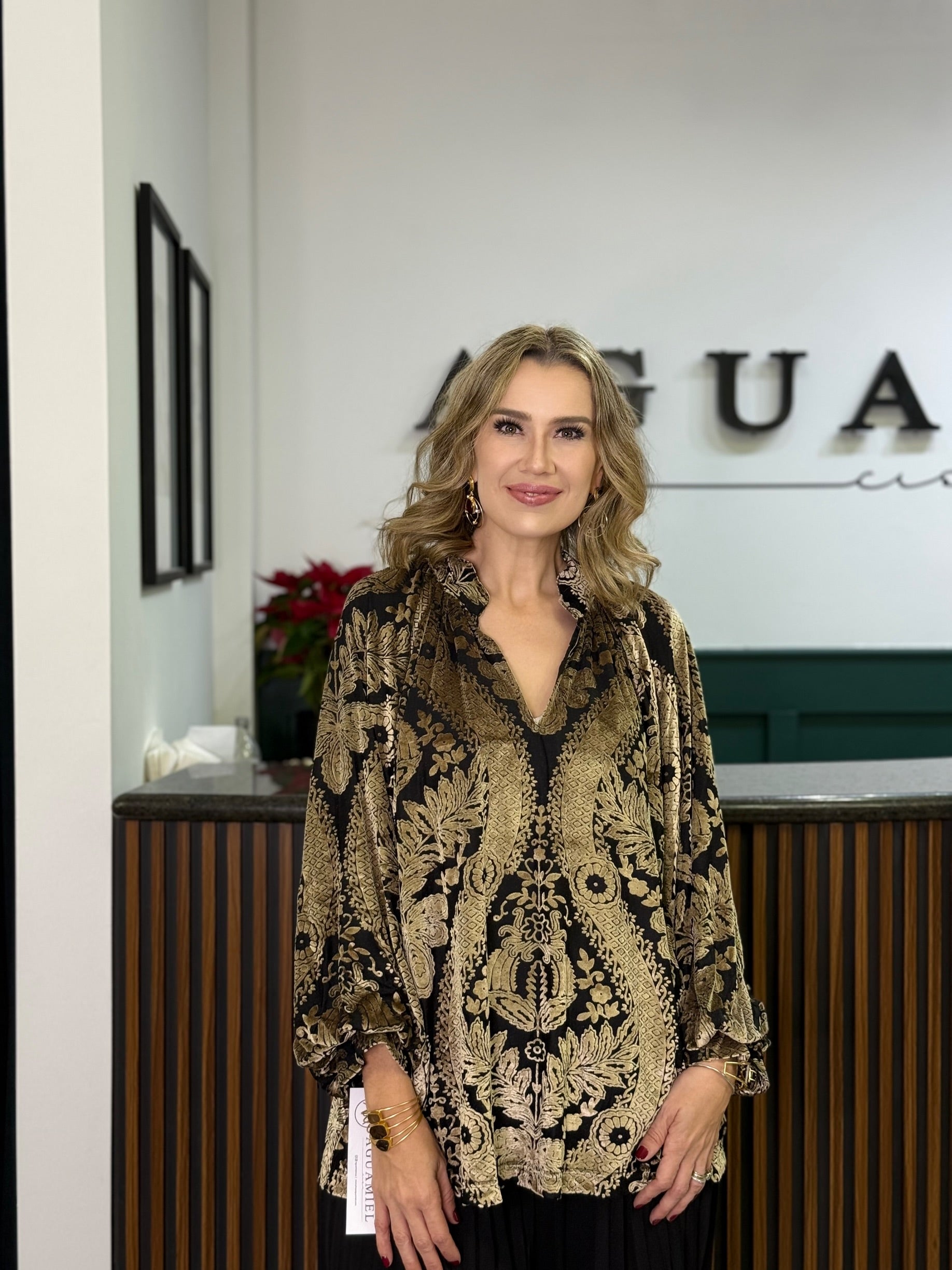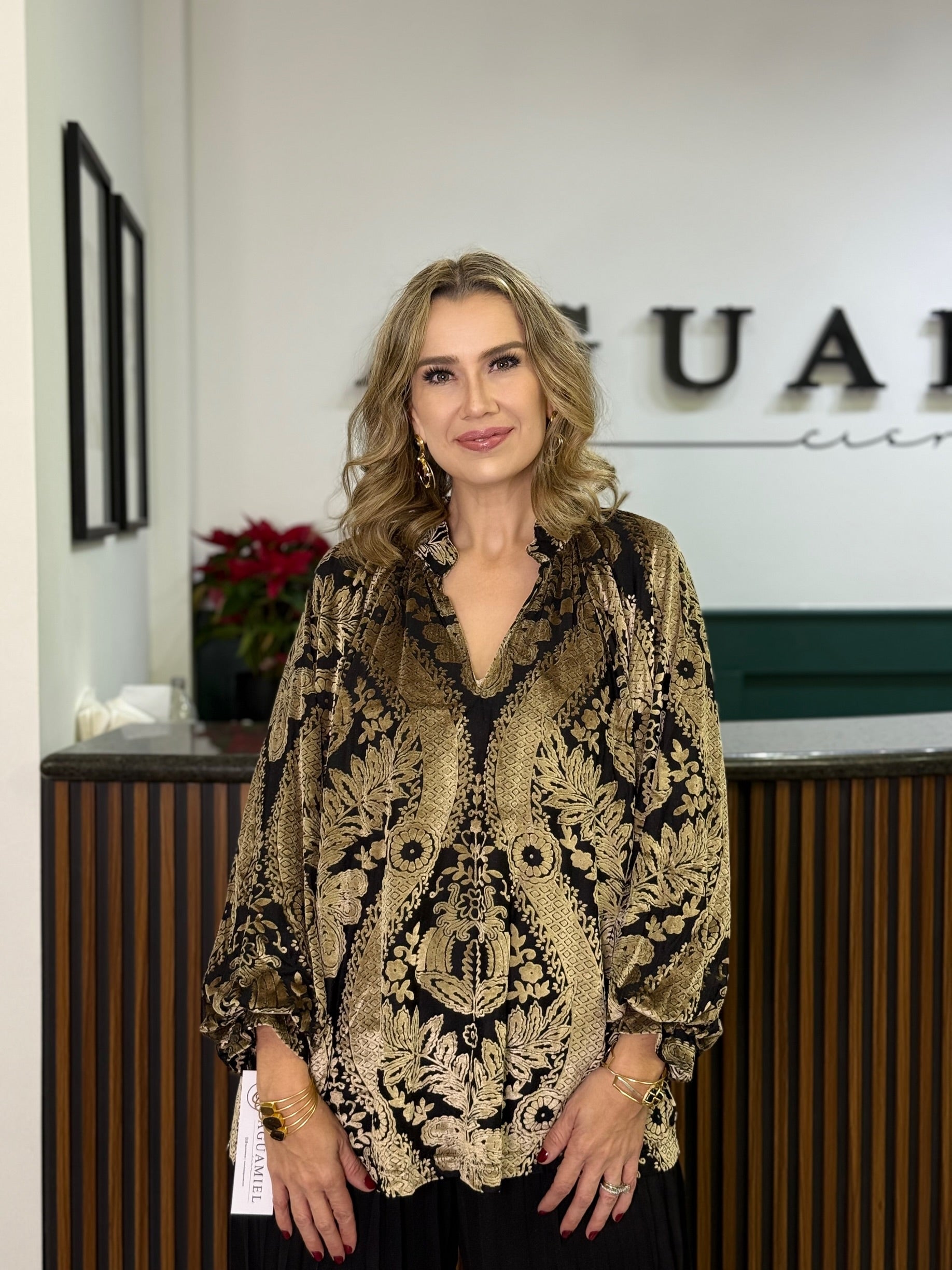 Suéter negro con estampado floral y mangas globo de estilo boho. Suave, moderno y perfecto para looks casuales con un toque femenino.
