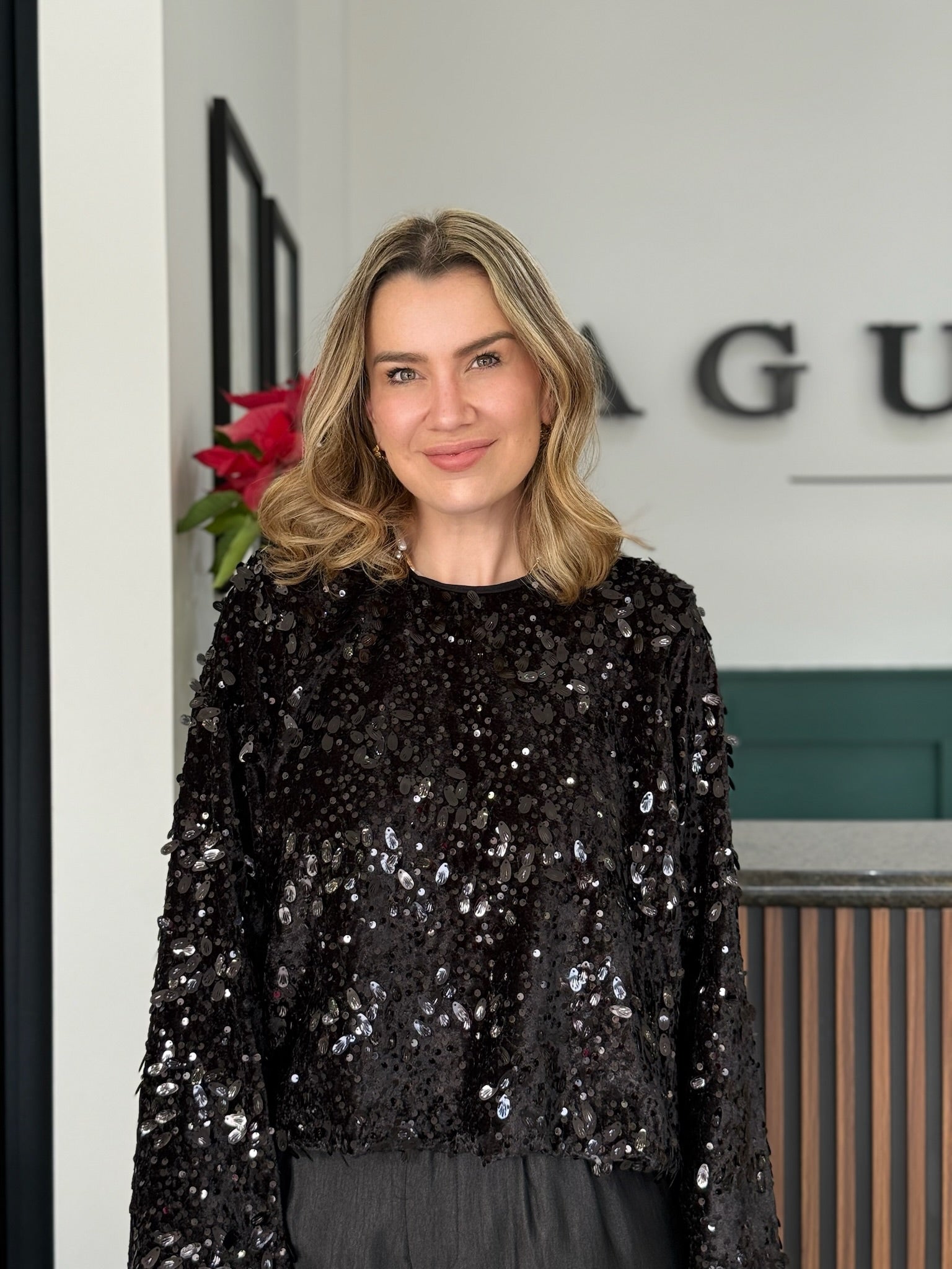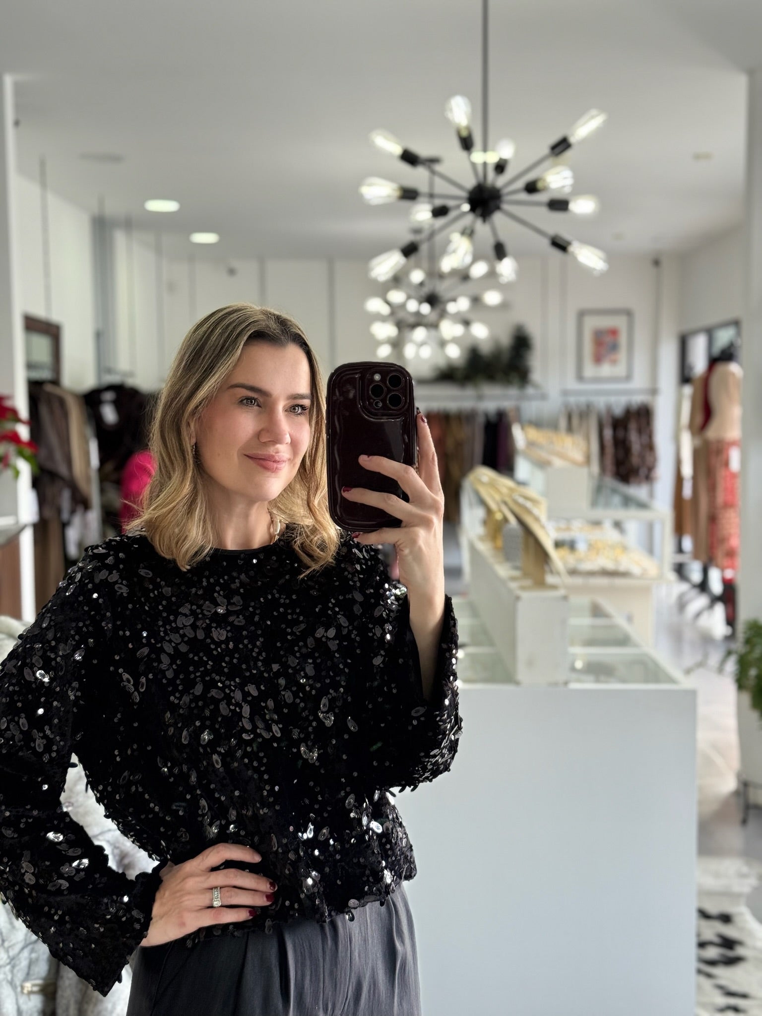 Suéter de lentejuela aplicadas a mano con caída ligera y brillo elegante. Ideal para noches especiales y eventos donde quieres destacar.