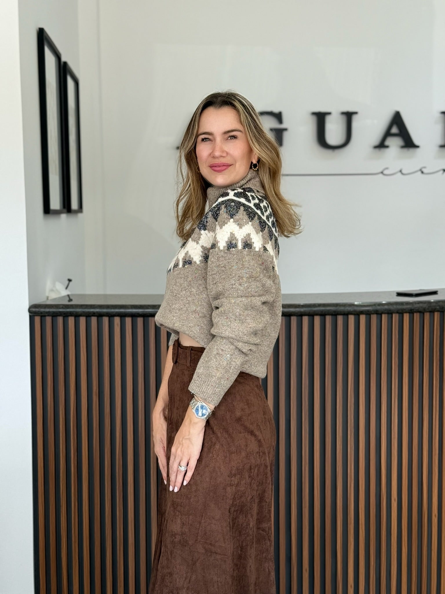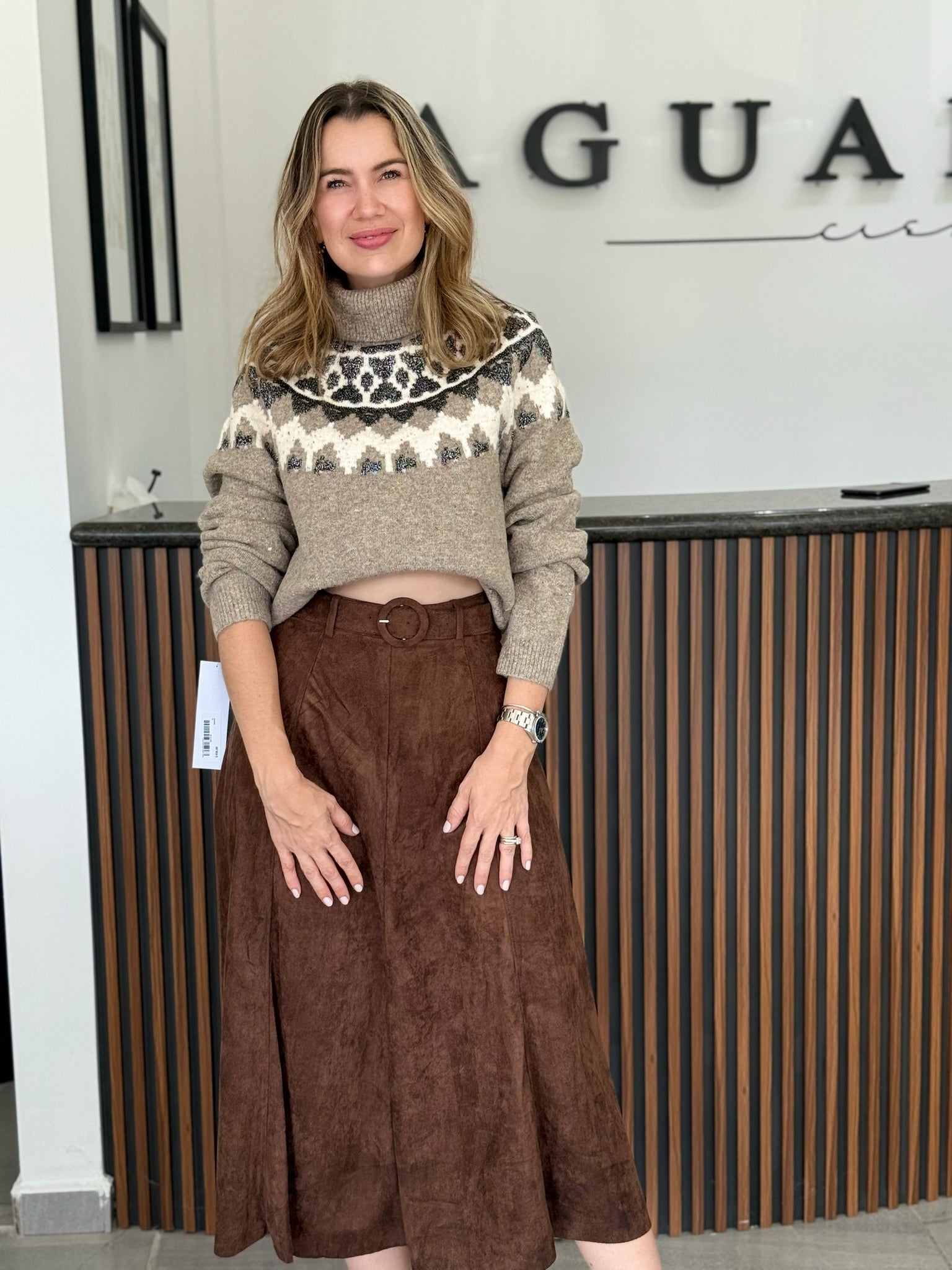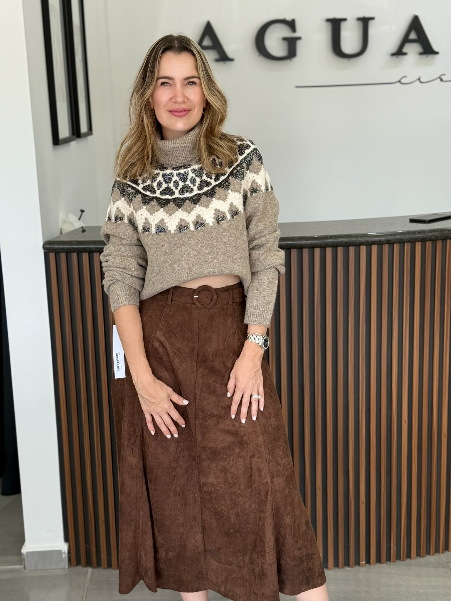 Cuenta con cuello alto y acabado cómodo, ideal para mantenerte abrigada con estilo en los días fríos. Perfecto para un look cozy y versátil.