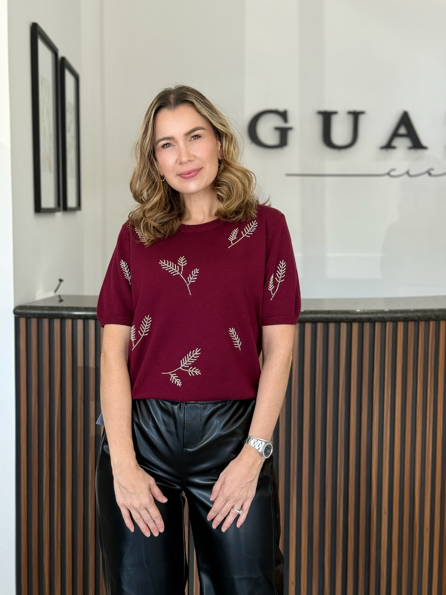 Suéter ligero de manga corta con bordados en forma de ramitas, ideal para un look casual y femenino. Combínalo con jeans o pantalón de vestir para un toque chic.