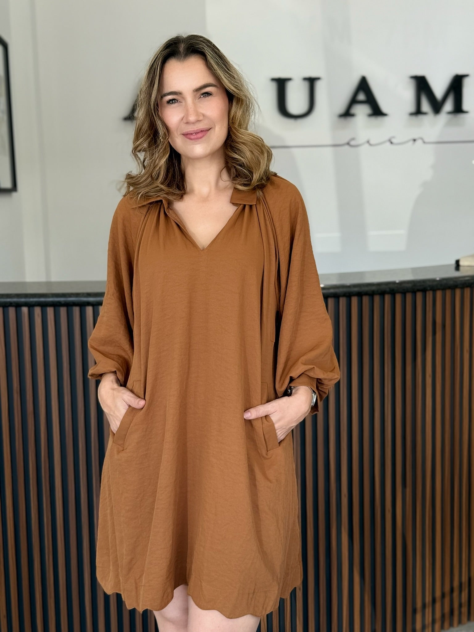 Vestido de corte suelto con cuello camisero y mangas 3/4 abullonadas. Su silueta relaxed lo convierte en la opción ideal para un look cómodo y moderno que puedes usar con botines o tenis.
