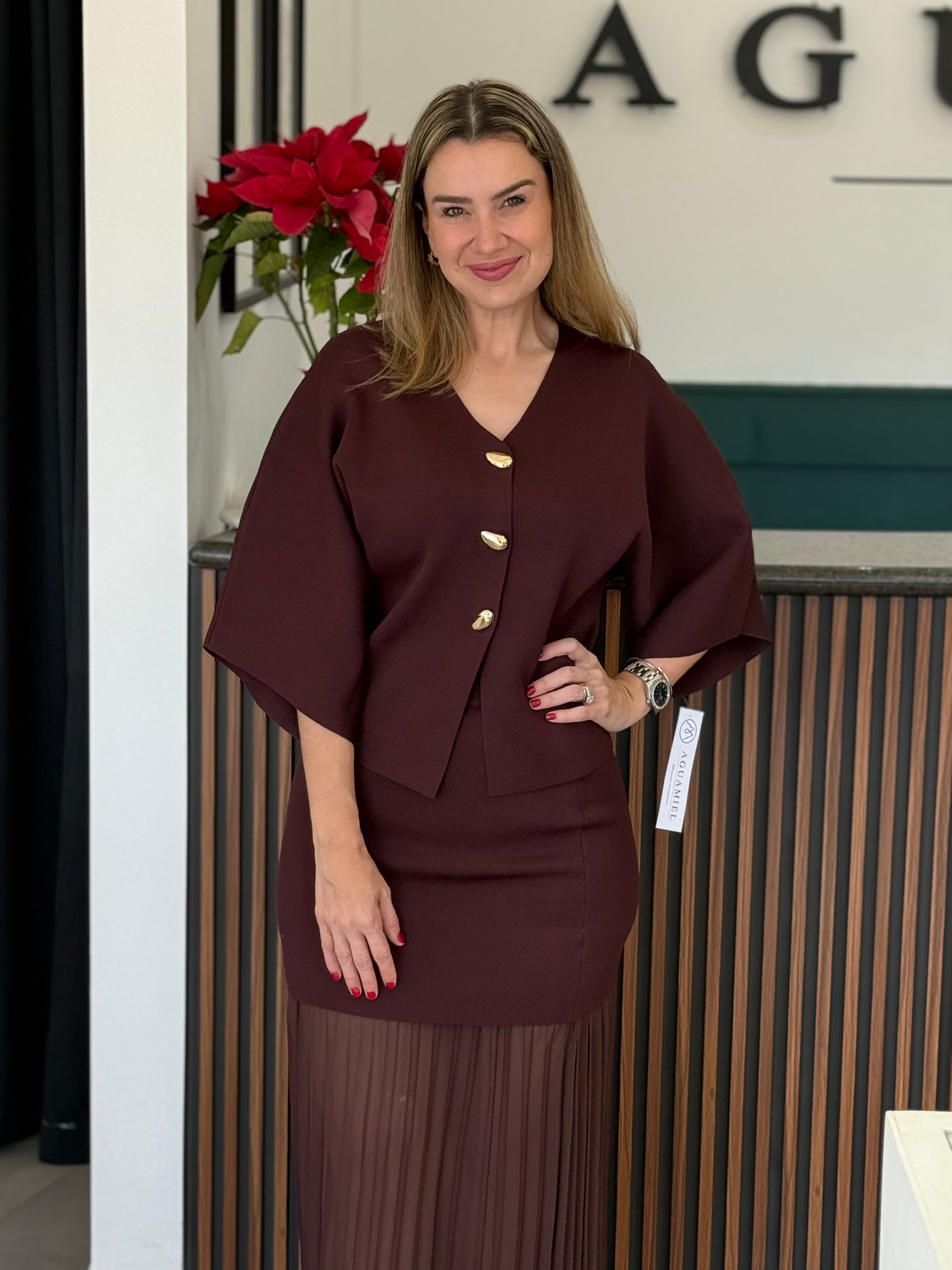 Conjunto de blusa fluida con botones decorativos y falda plisada que aporta movimiento y feminidad. Una propuesta elegante y atemporal, ideal para ocasiones especiales o para un look refinado sin esfuerzo.
